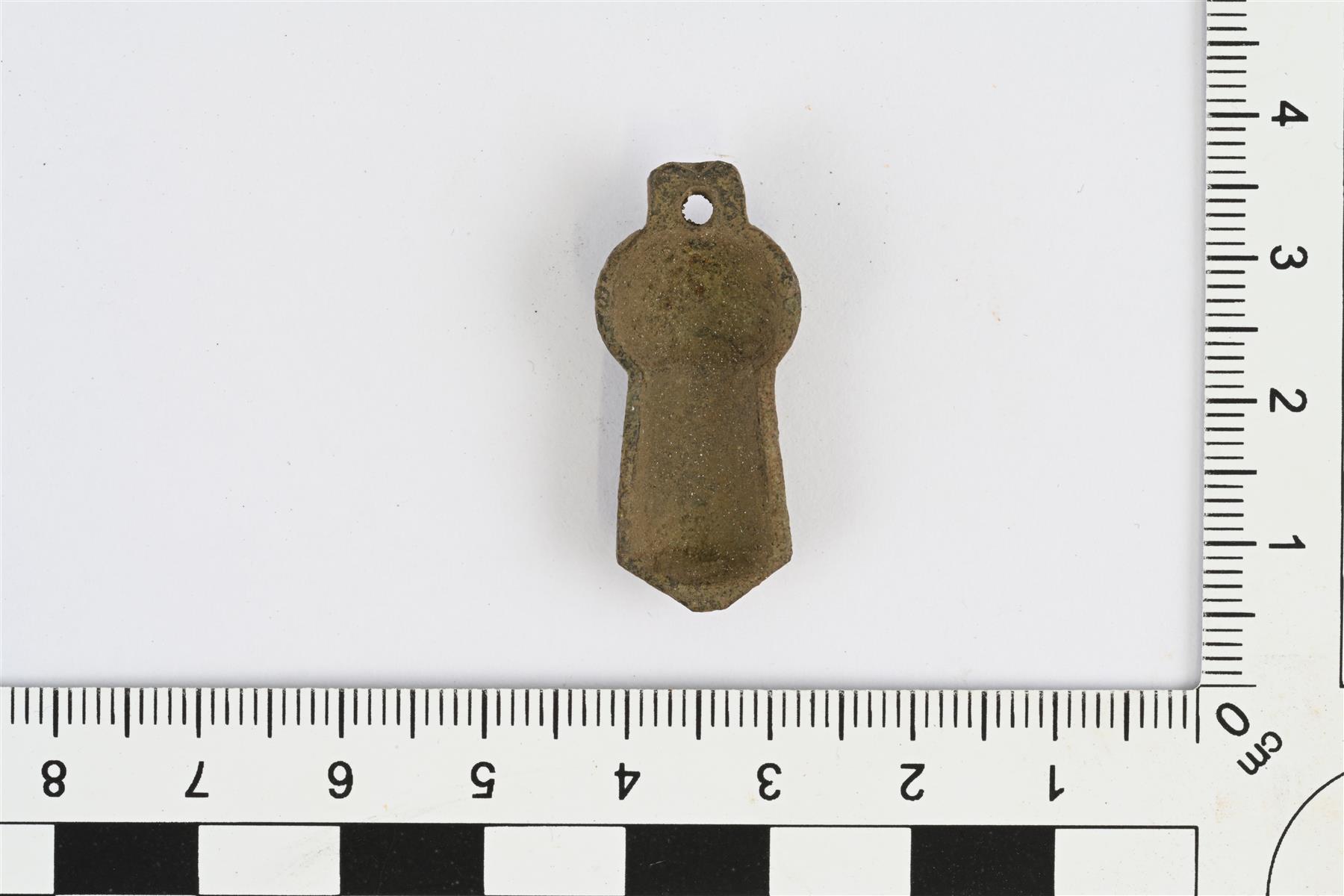 | Riipus tms. Pieni pitkänomainen esine, jonka etupuoli kupera ja taustapuoli kovera. Yläpäässä tukeva nelikulmainen lenkki, sen alapuolella pallomainen osa ja alimpana pitkänomainen osa. | |