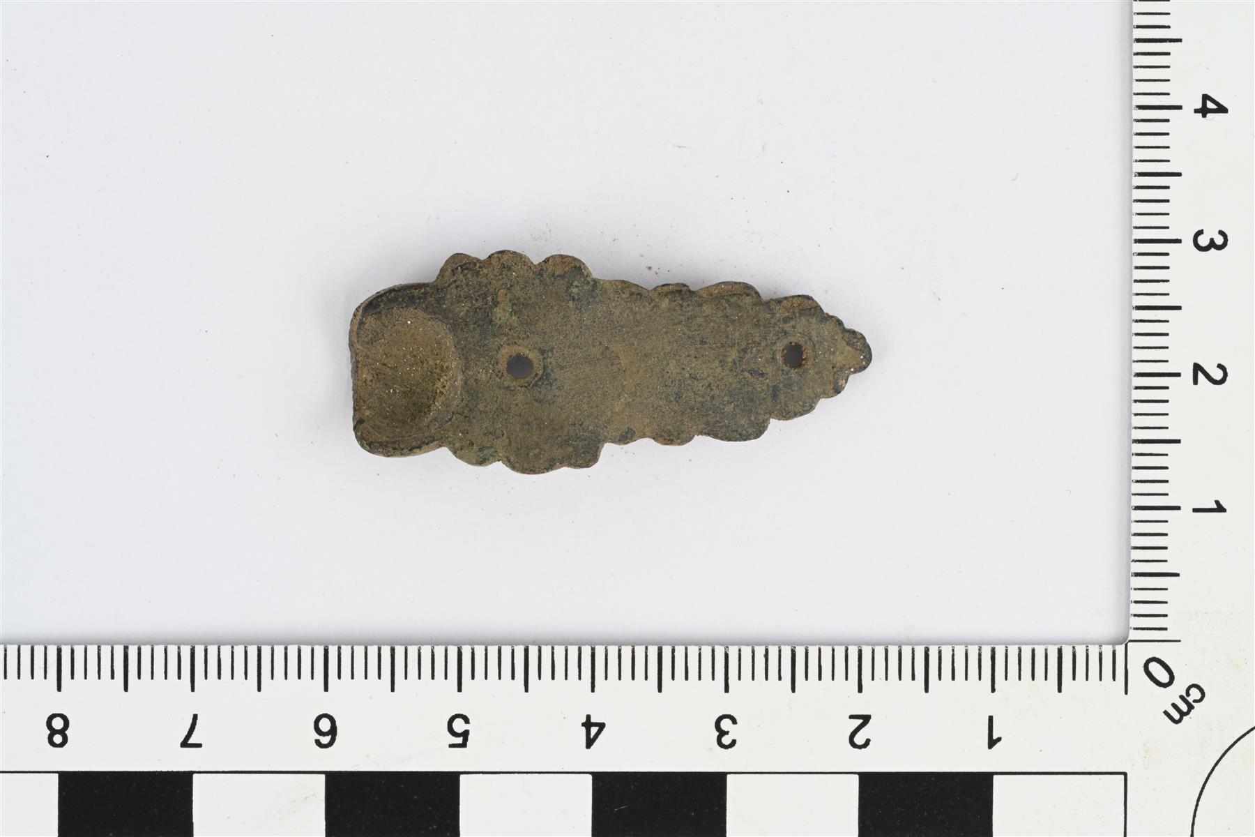 | Koristehela tms. Pitkänomainen ja litteä lehvän muotoinen esine, jonka toisessa päässä kupera pallomainen osa. Lehvänmuotoisessa osassa kaksi pientä reikää. Vääntynyt. | |