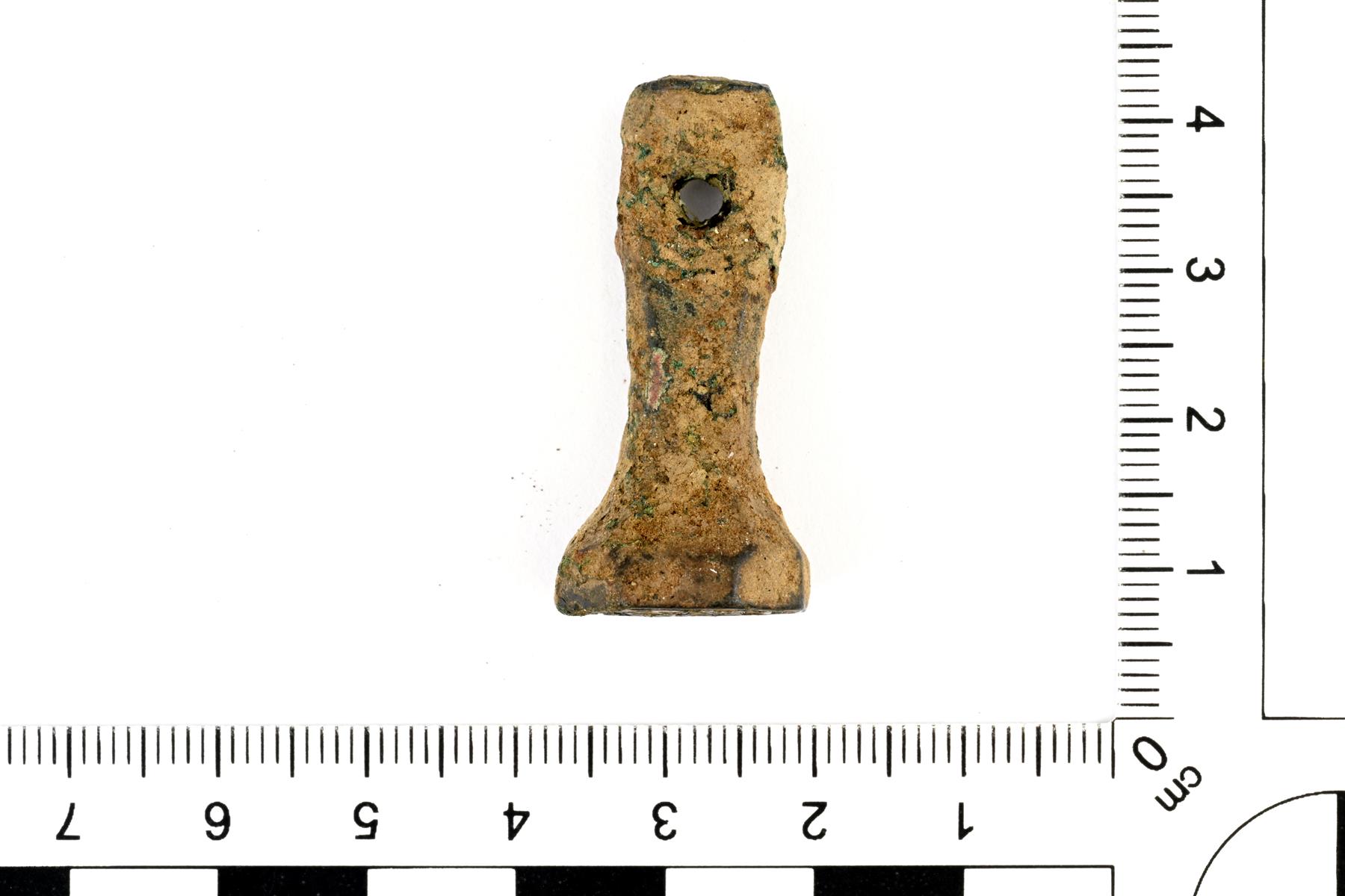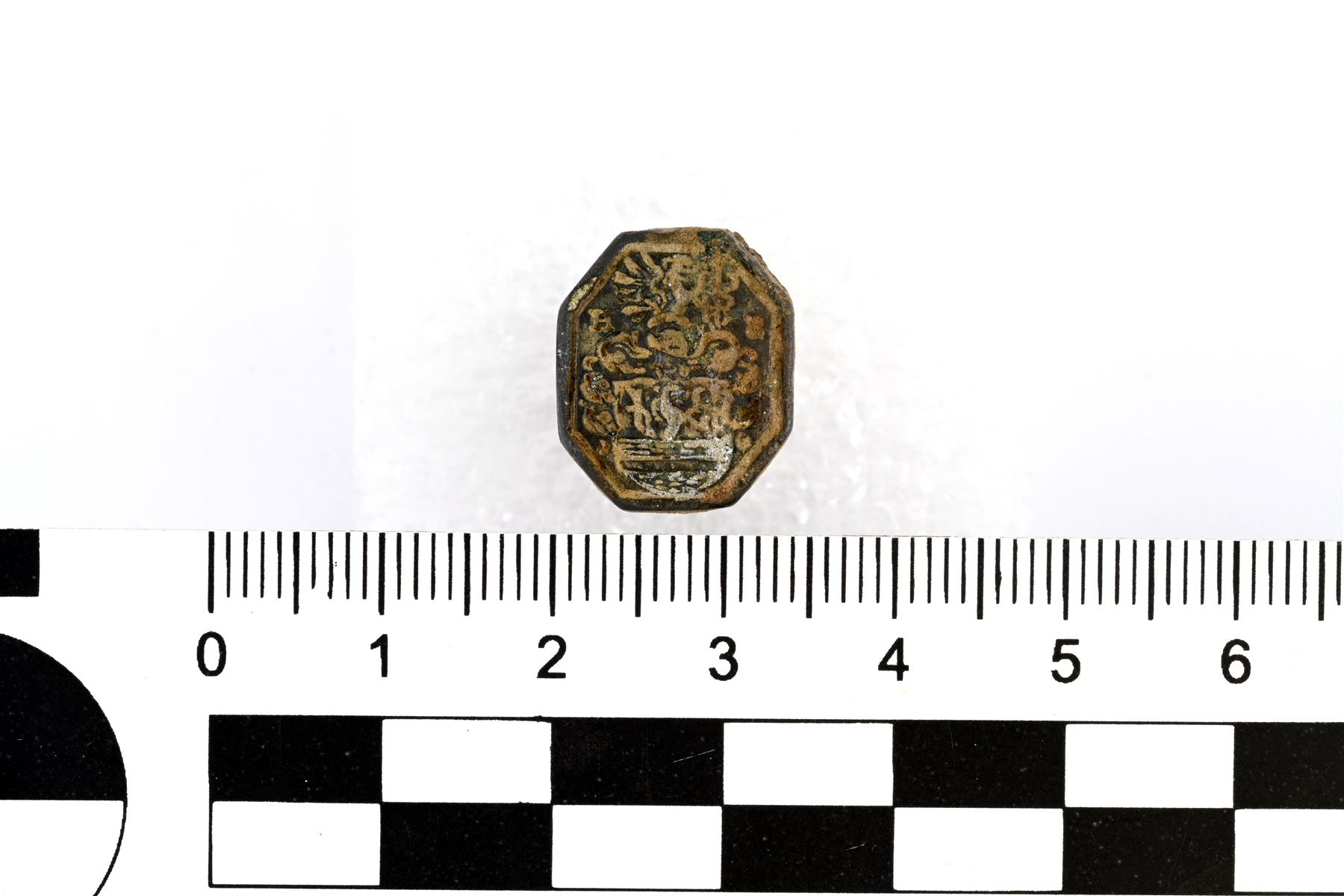 | Varrellinen sinettileimasin. Alaosa on muodoltaan kahdeksankulmio ja siihen on kaiverrettu lintuaiheinen kuvio. Varressa on reikä. | |