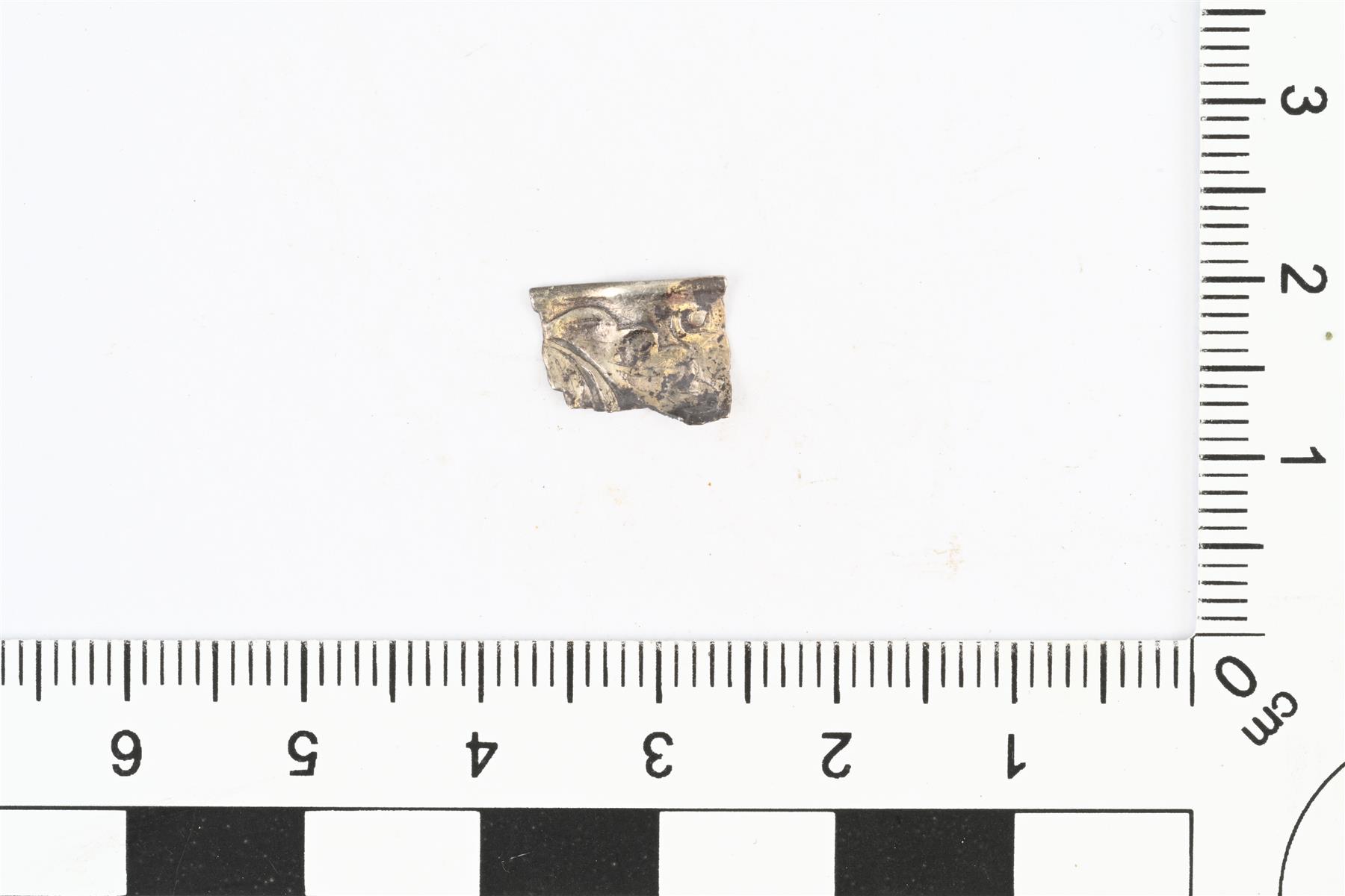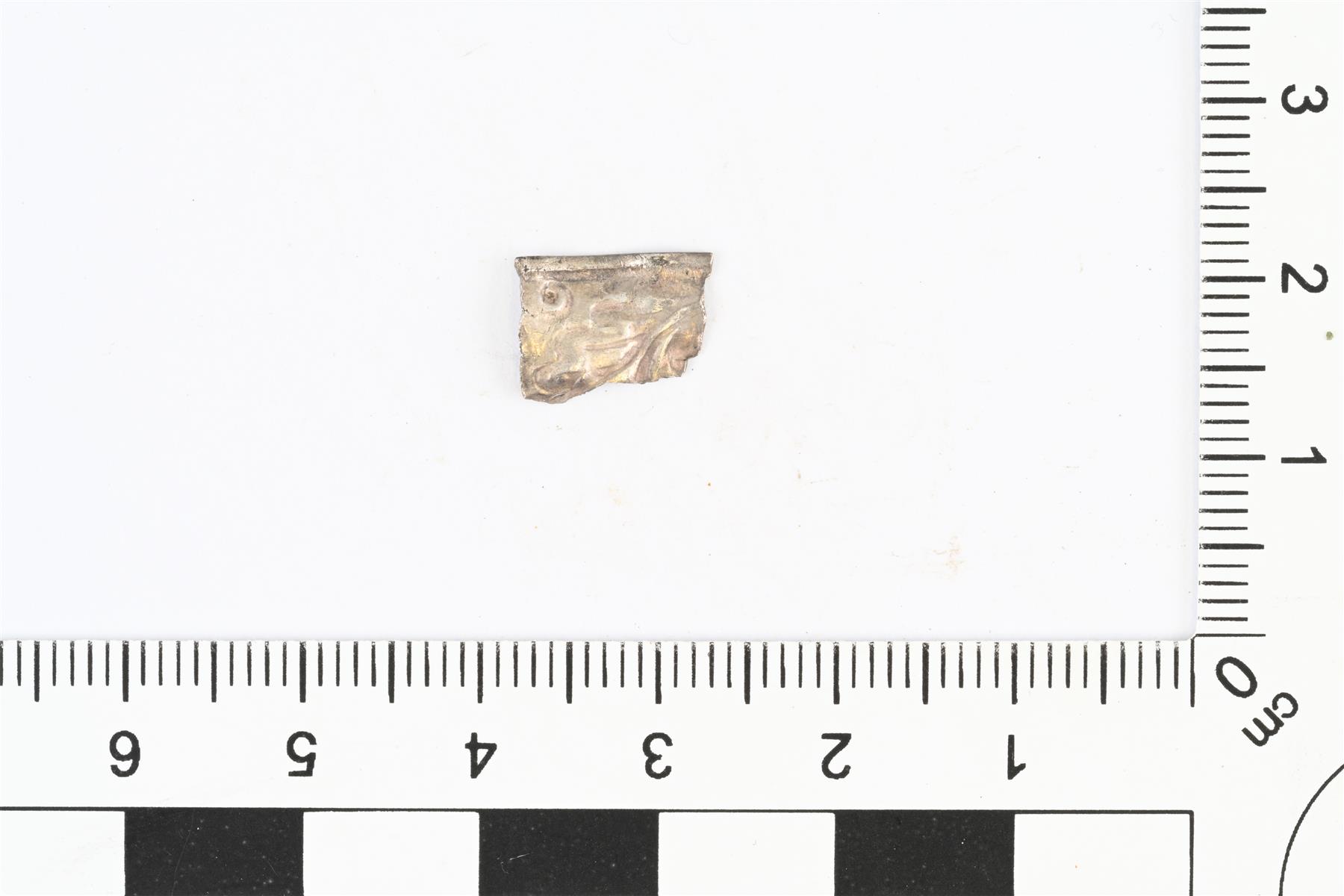 | Lehväkoristeisen hopeaesineen katkelma. Ohutta levyä. Yksi ehjä suora reuna, joka taitettu kaksinkertaiseksi. Pakotettua tai leimattua lehväaiheista koristelua, joka näkyy levyn molemmilla puolilla. Vääntynyt. | |