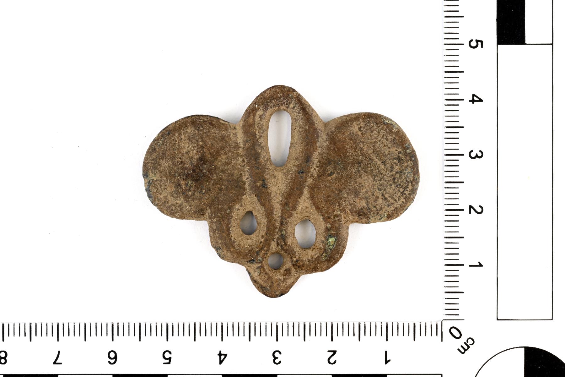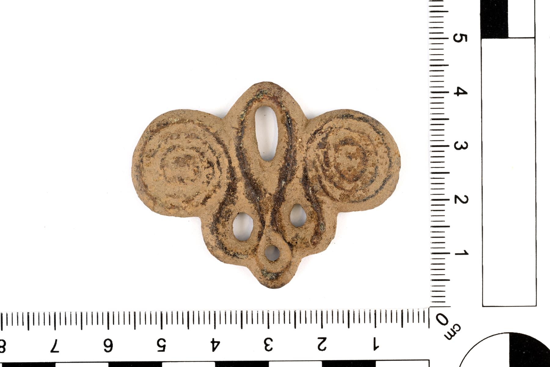 | Hyväkuntoinen ketjunkantaja. Kummallakin sivulla on pyöreät korvakkeet, joissa on viivauurteella tehdyt spiraalikuviot. Yläosassa on yksi ripustuslenkki ja alaosassa kolme. Vrt. Kivikoski Abb. 767 ja 1110. | |