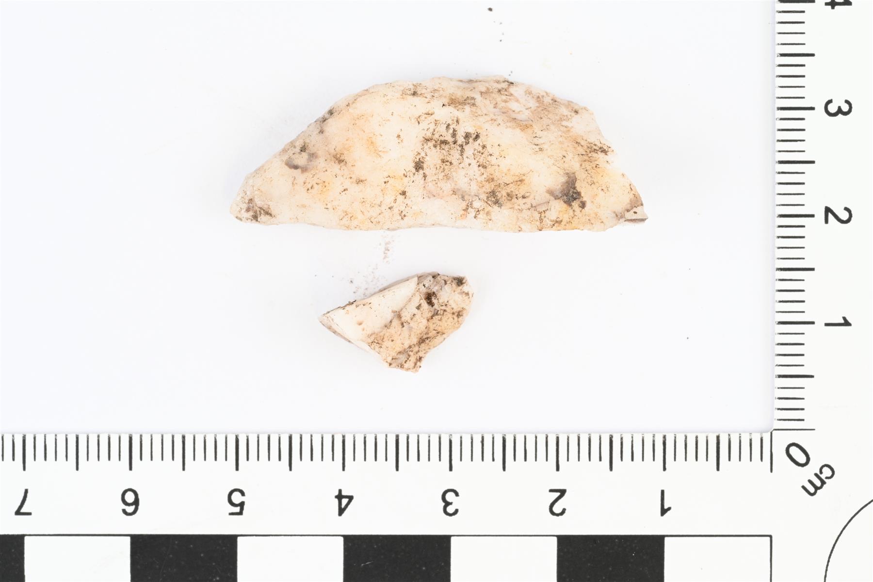 | Kahteen osaan haljennut teräväsärmäinen kvartsi-iskos. Palojen koot 39 x 20 x 14 mm ja 16 x 9 x 9 mm. Palan pituus enne kahtia halkeamista ollut noin 47 mm. | |