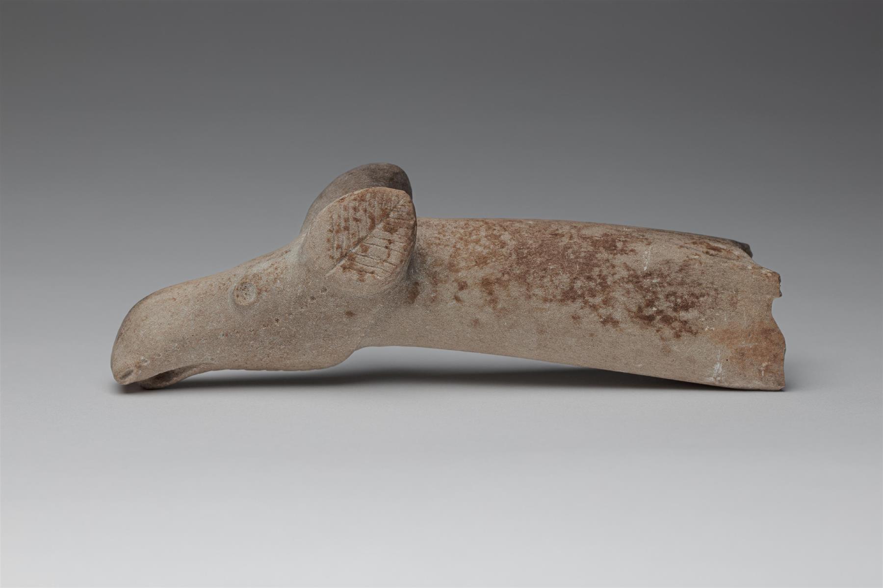 | Ns. Iisalmen tyypin reikäkirveen hamara, johon on muotoiltu Säkkijärven hirveä läheisesti muistuttava hirvilehmän tai vasan pää. Katkennut varsireiän kohdalta. Kaulan ylä- ja alapuoli, korvat, turpa, leukaperät ja otsa koristeltu tikkauspistelinjoin ja uurtein. Koristelussa on joitakin samoja piirteitä kuin Rovaniemen karhunpääkirveessä. Harmaaksi patinoitunut tiivis kivilaji (niskan kohdalta ruskeaksi läiskittynyt). Turvan toisella lappeella ilmeisesti rautakangen löytöhetkellä aiheuttama murtopinta. Varsireiän sisäpinnalla musta tahra (hartsia?). Varsireiän alasuulla laajempi tikkaamalla muotoiltu kuopanne. Hirven suun kohdalle on työstetty poikittaissuunnassa pieni soikea reikä.
