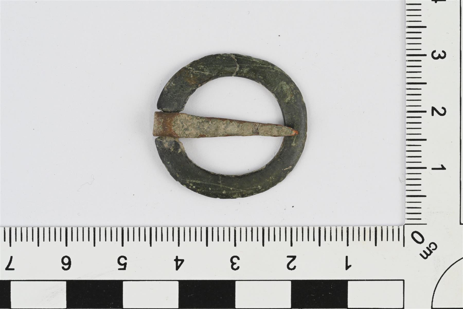 | Pieni pyöreä kehäsolki. Kehä litteähkö, poikkileikkauksessa etupuoli kupera ja taustapuoli tasainen. Kapean venytetyn kolmion muotoinen neula, jonka tyvi kierretty kehän kavennettuun kohtaan. Paksuus mitattu neulan tyven kohdalta, kehän paksuus 1,5 mm. | |