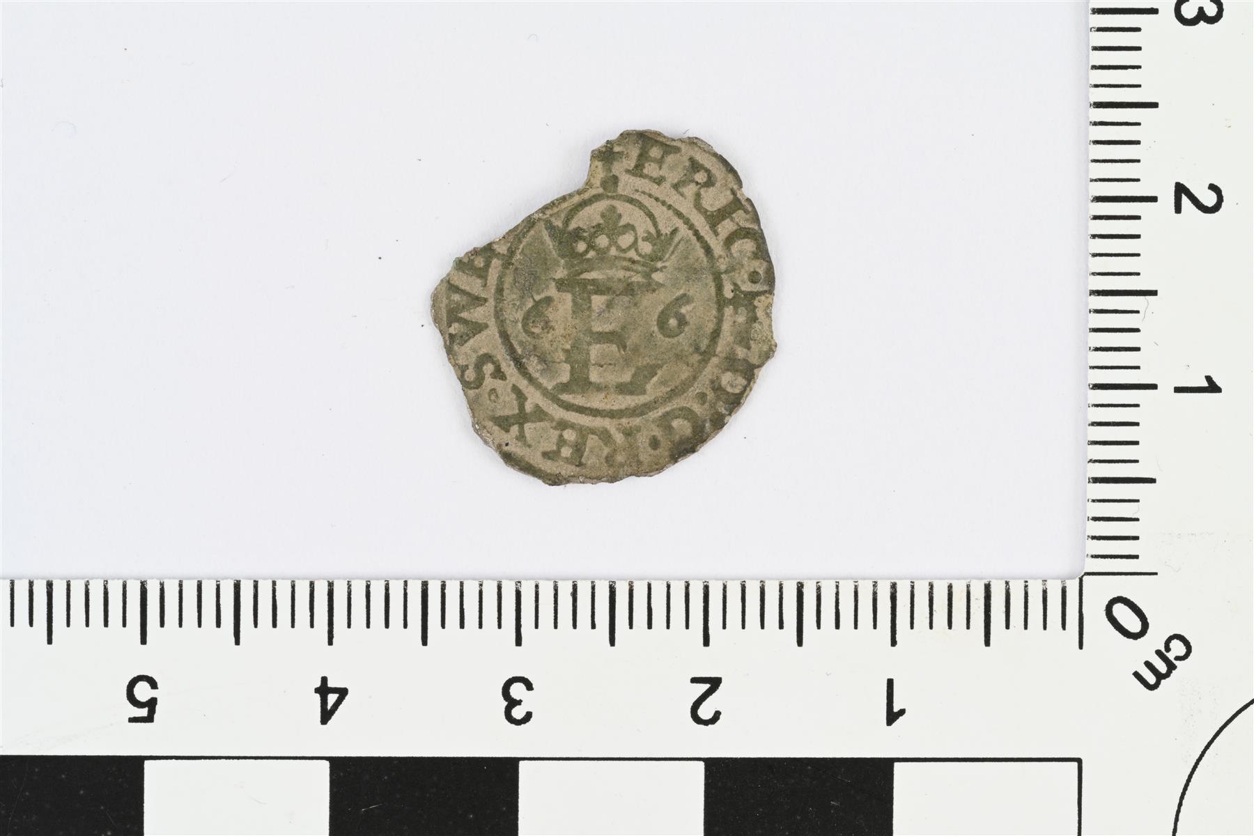 | Eerik XIV, ½ äyriä, Tukholma 1566 (SM 40). Reuna murtunut. Tunnistus Frida Ehrnsten, Kansallismuseon rahakammio. | |