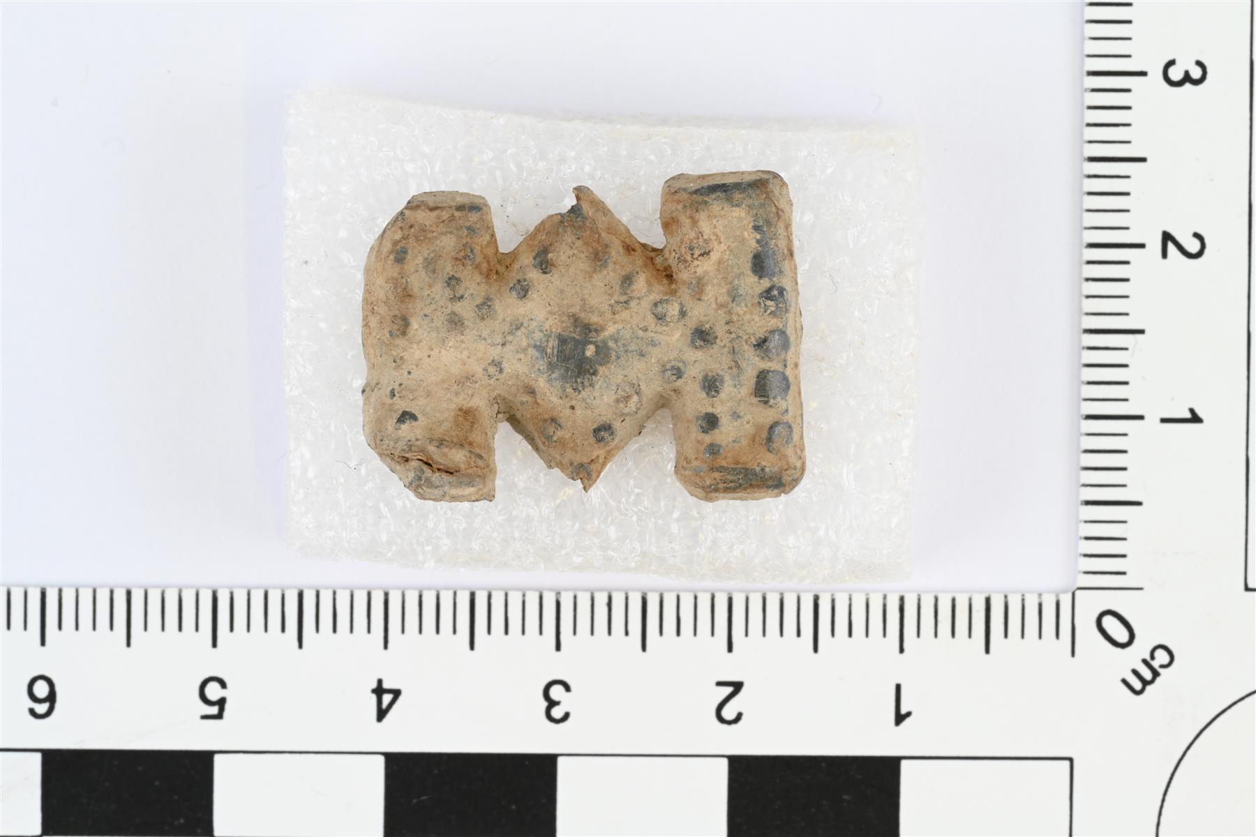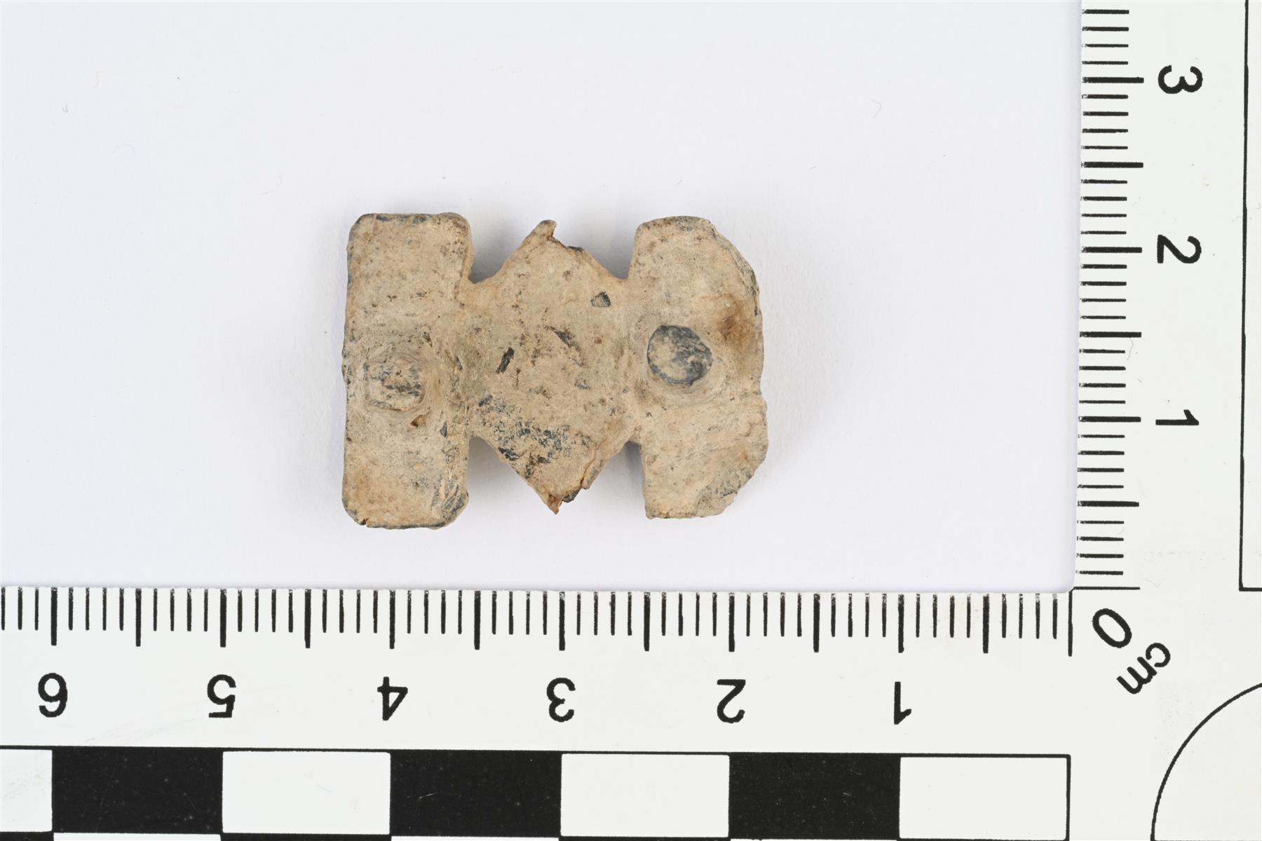 | Vyön- tai hihnanhela. Harmaata metalliseosta, todennäköisesti tinaseosta. Muodoltaan pitkänomainen ja kolmijakoinen, keskellä vinoneliön muotoinen osa ja sen päissä suorakulmion muotoiset osat. Taustapuolella päissä kiinnitystapit. Etupuolella reunoja kiertävä kohopistekoristelu. Vääntynyt. Paksuus mitattu tappien kohdalta, helan paksuus muuten 3 mm. | |