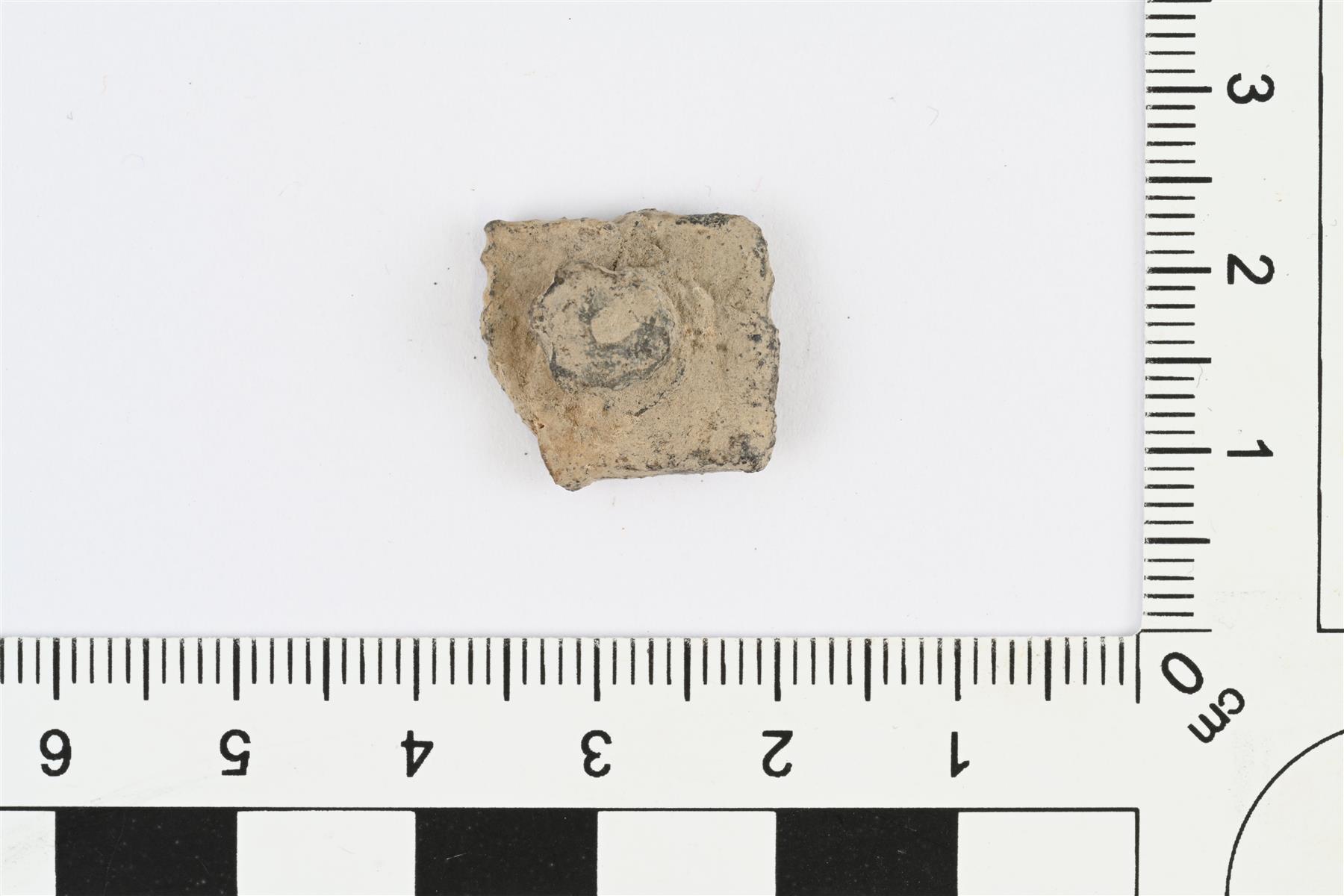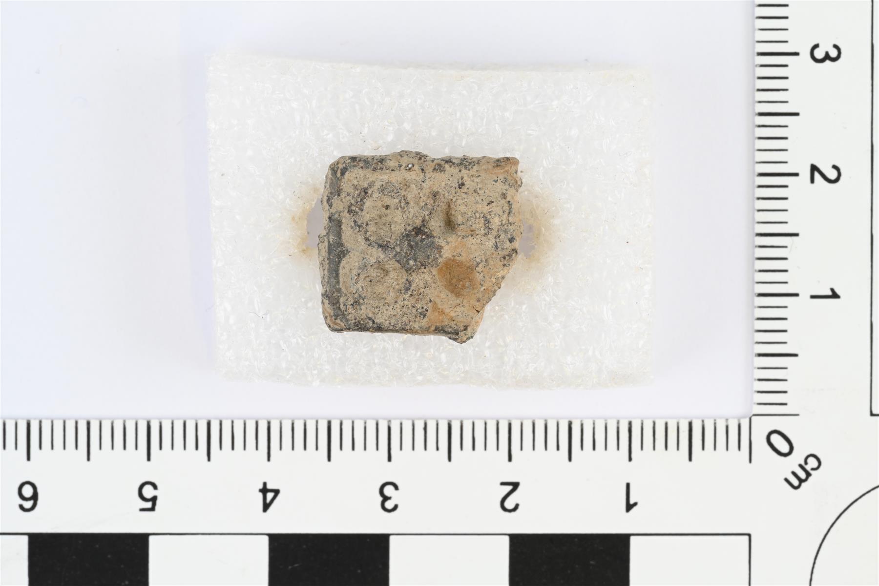 | Neliönmuotoinen vyön- tai hihnanhela. Harmaata metalliseosta, todennäköisesti tinaseosta. Taustapuolella paksu kiinnitysnasta. Etupuolella keskellä pyöreä kohouma ja sen ympärillä neljä pyöreää syvennystä, jotka muodostavat vinoristin tai kukkakuvion. Yksi kulma murtunut. Paksuus mitattu tapin kohdalta, helan paksuus muuten 3 mm. | |
