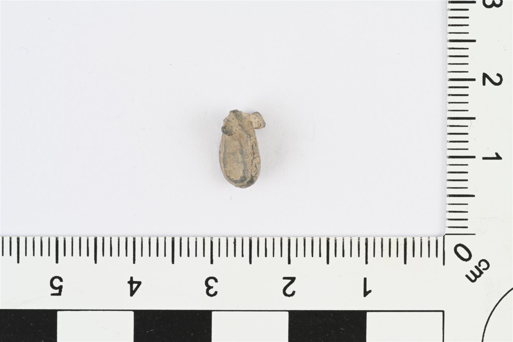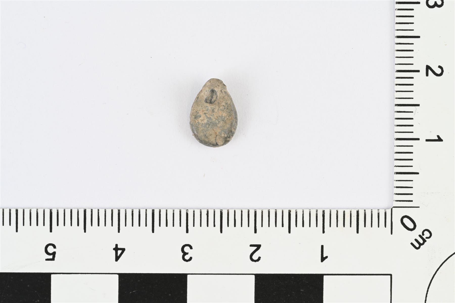 | Pieni metaliesine, esineen osa tai katkelma. Harmaata metalliseosta, luultavasti tinaseosta. Litteähkö pisaranmuotoinen esine, jonka terävässä päässä molemmilla pinnoilla pieni tappi. Paksuus mitattu tappien kohdalta, muuten esineen paksuus 2,5 mm. | |