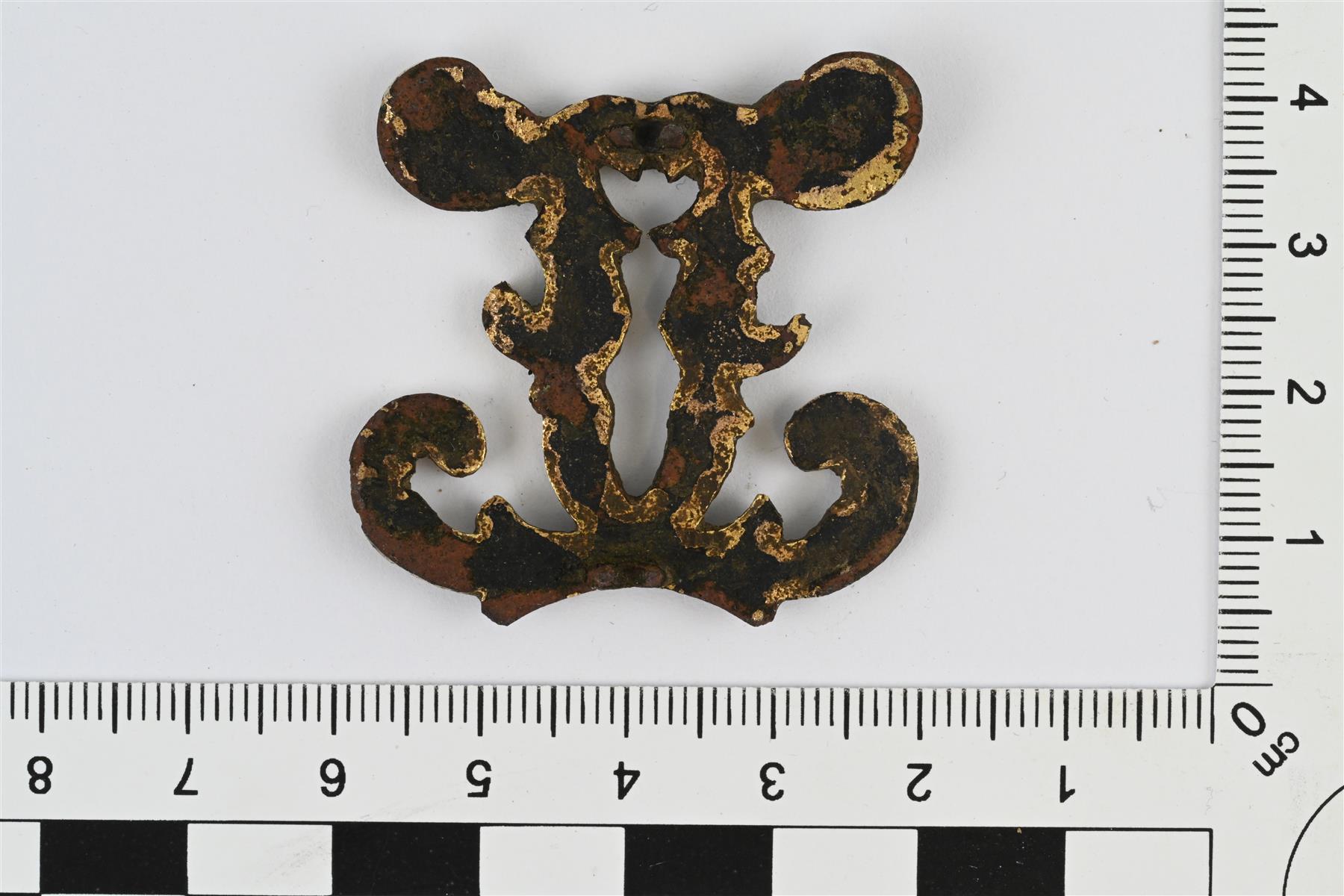 Koriste, mahdollisesti huonekalusta. Litteä, puhkonainen. Koristeessa luultavasti monogrammi, jossa kaksi samanlaista yhteen kietoutunutta kirjainta, jotka ovat toistensa peilikuvia. Muistuttaa kolikoissa esiintyvää Fredrik I:n monogrammia, joskaan ei ole identtinen. Kirjain voisi olla F, I, J tai T. Kirjaimet kiemuraisia ja lehvämäisiä, niiden etupuolella kirjainten muotoa myötäilevää reliefikoristelua. Etupuolella mahdollisesti kultausta. Taustapuolella kiinnittiminä ylä- ja alareunassa pienet parittaiset tapit, jotka voisivat olla myös lenkin jäänteet. Paksuus mitattu tappien kohdalta, muuten paksuus 3 mm. | |