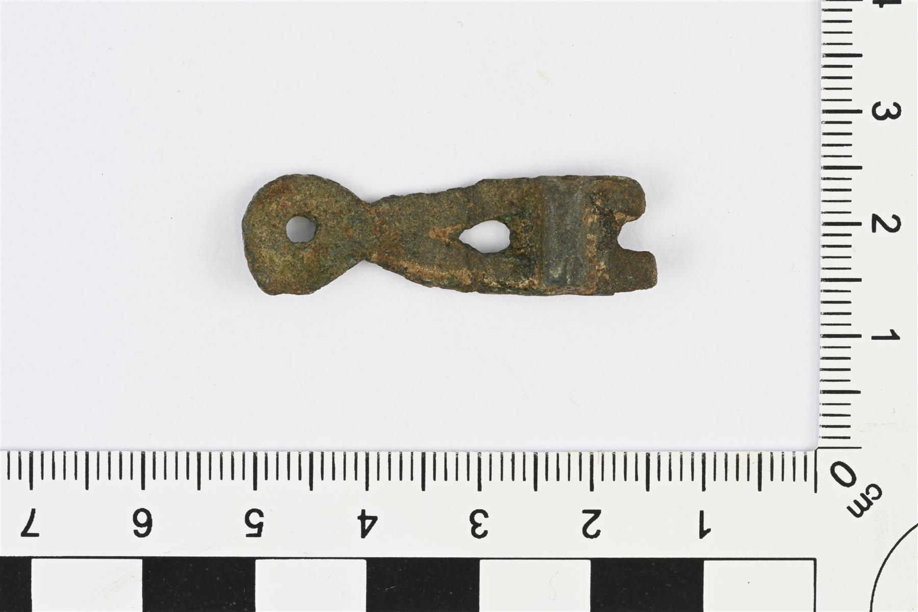 Koristellun kupariseosesineen katkelma. Pitkänomainen, litteä ja sivusta katsoen hieman kaareva. Nauhapunoskoristeinen, puhkonainen. Ehjässä päässä punoutuva nauha muodostaa kahdeksikon, jonka lenkkien keskellä reiät. Nauhassa reliefikoristeluna reunaa kiertävät kapeat hammastetut kohovyöt ja keskellä rivi kohopalloja. Murtumakohdan lähellä pallokoristeinen nauha punoutuu yhteen toisen, puuttuvasta esineen osasta tulevan nauhan kanssa. Toisessa nauhassa reunoissa hammastetut kohovyöt ja keskellä sileä kohovyö. Taustapuolella lähellä murtumakohtaa, nauhapunosten yhtymäkohdassa, poikittainen putkimainen paksunnos, jonka läpi kulkee reikä esineen poikkisuunnassa. Paksuus mitattu paksunnoksen kohdalta, litteän osan paksuus 1,5 mm. | |