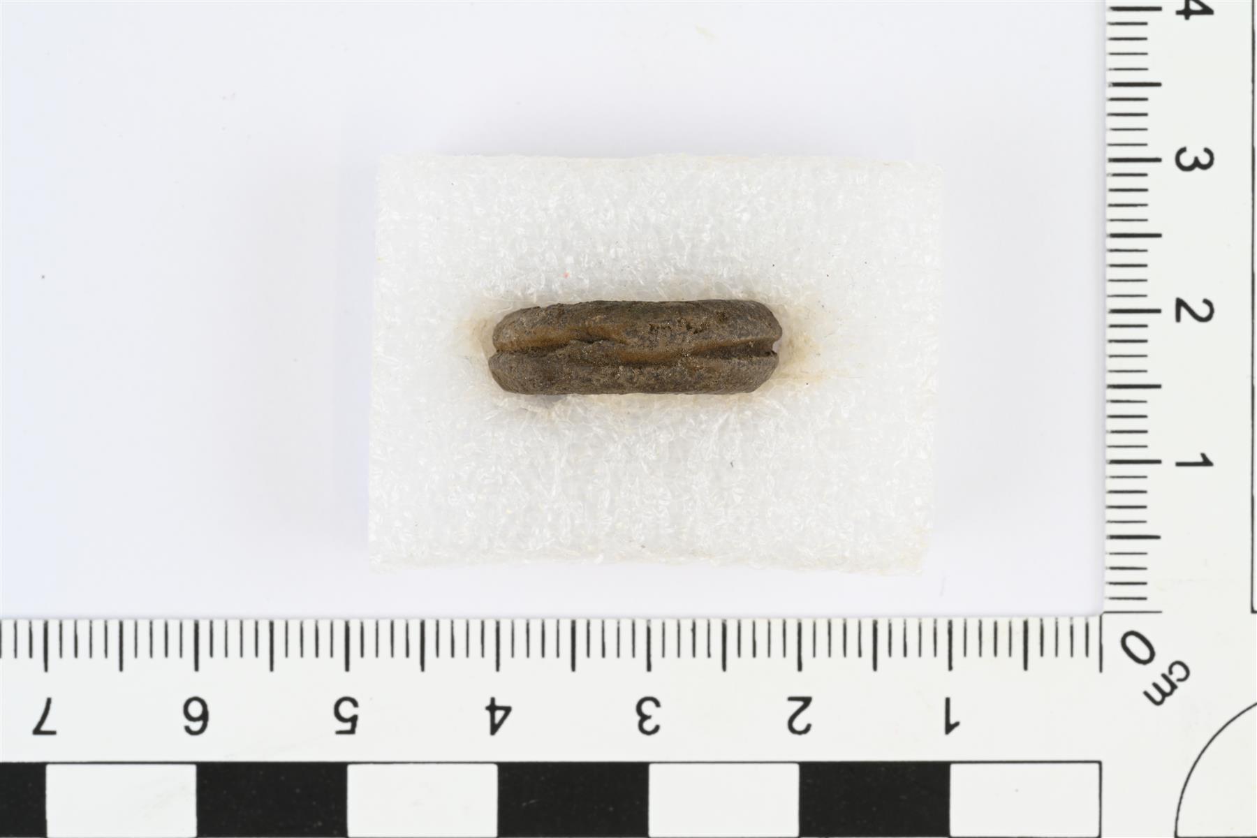 Kansainvaellusaikainen miekkavyön rengashela. Umpinainen rengas, jonka poikkileikkaus soikeahko, korkeus 5,5-6 mm ja leveys 4-4,5 mm. Renkaan ulkopinnalla puolivälissä vaakasuora uraviiva, jonka päät eivät ole osuneet aivan kohdakkain. | |