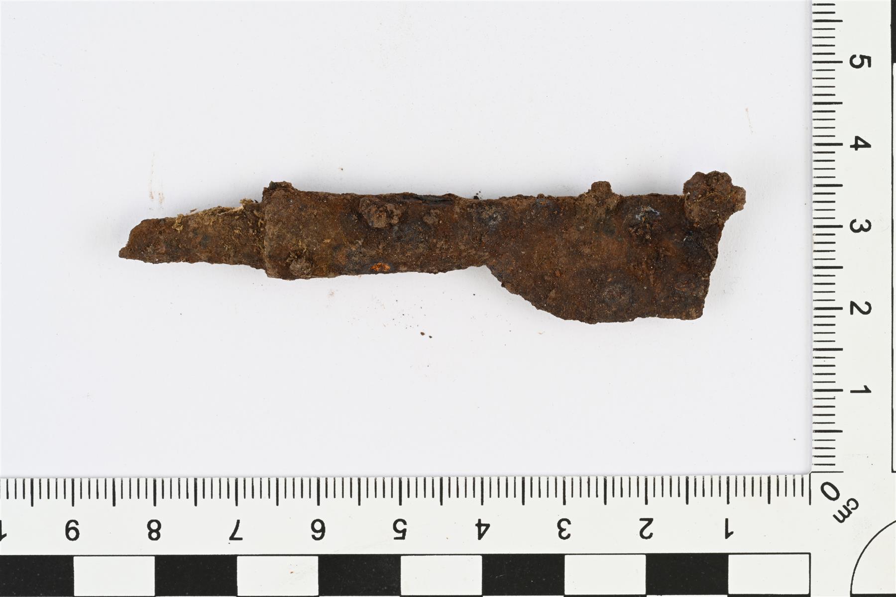 | Ruodollisen pöytäveitsen katkelma. Sekä terä että ruoto katkelmalliset. Terän ja ruodon välissä poikkileikkaukseltaan soikea kaula, jonka yläreuna on hamaran tasolla. Kaula levenee hieman ruotoa kohti. Kaulan mitat 10,5 x 7 mm. Hamara säilyneeltä osaltaan suora. Teränsuu kaulan jälkeen levenee kuperasti, muuten säilyneeltä osaltaan suora. Hamaran paksuus 2,5 mm. | |