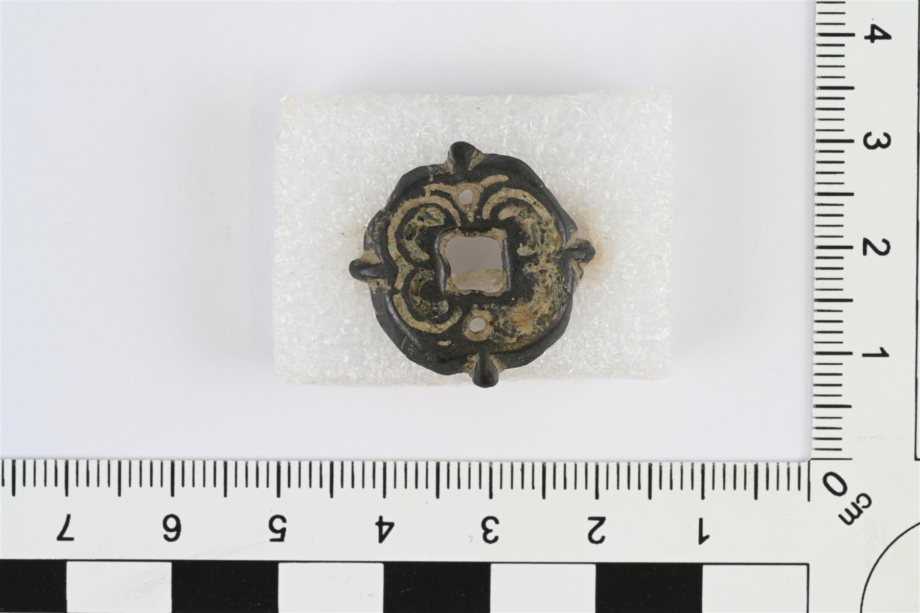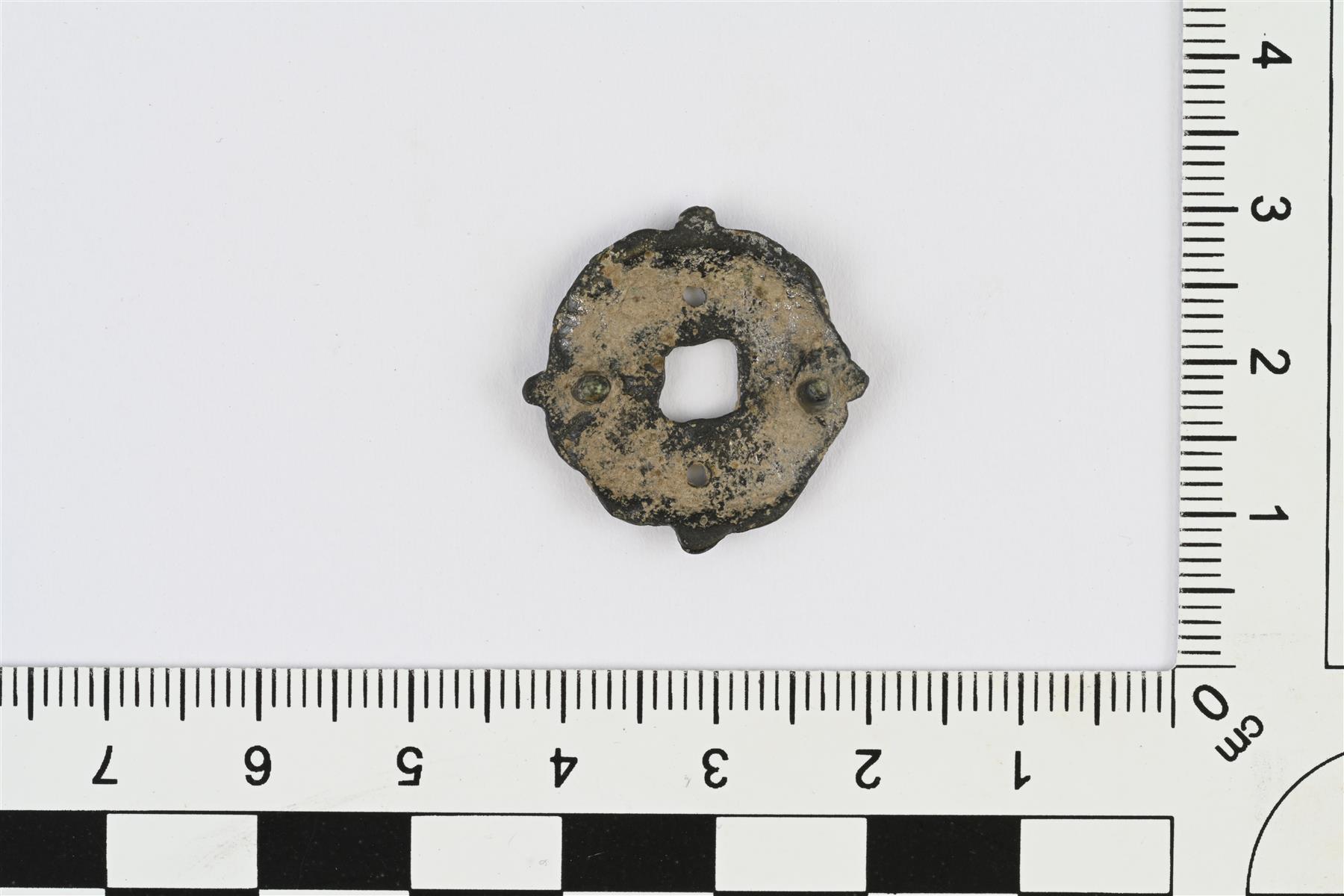 | Pyöreähkö hela. Etupuoli hieman kupera ja taustapuoli kovera. Keskellä neliönmuotoinen reikä. Neliön sivujen kohdalla helan ulkoreunassa pienet ulokkeet. Neliönmuotoisen reiän molemmin puolin, neliön sivujen keskikohdalla pienet pyöreät reiät. Neliön kahden muun sivun kohdalla taustapuolella pienet tapit. Etupuolella viivakoristelua, joka muodostaa neliön kulmien kohdalle pyöreät kuviot, kuin kukan terälehdet. | |