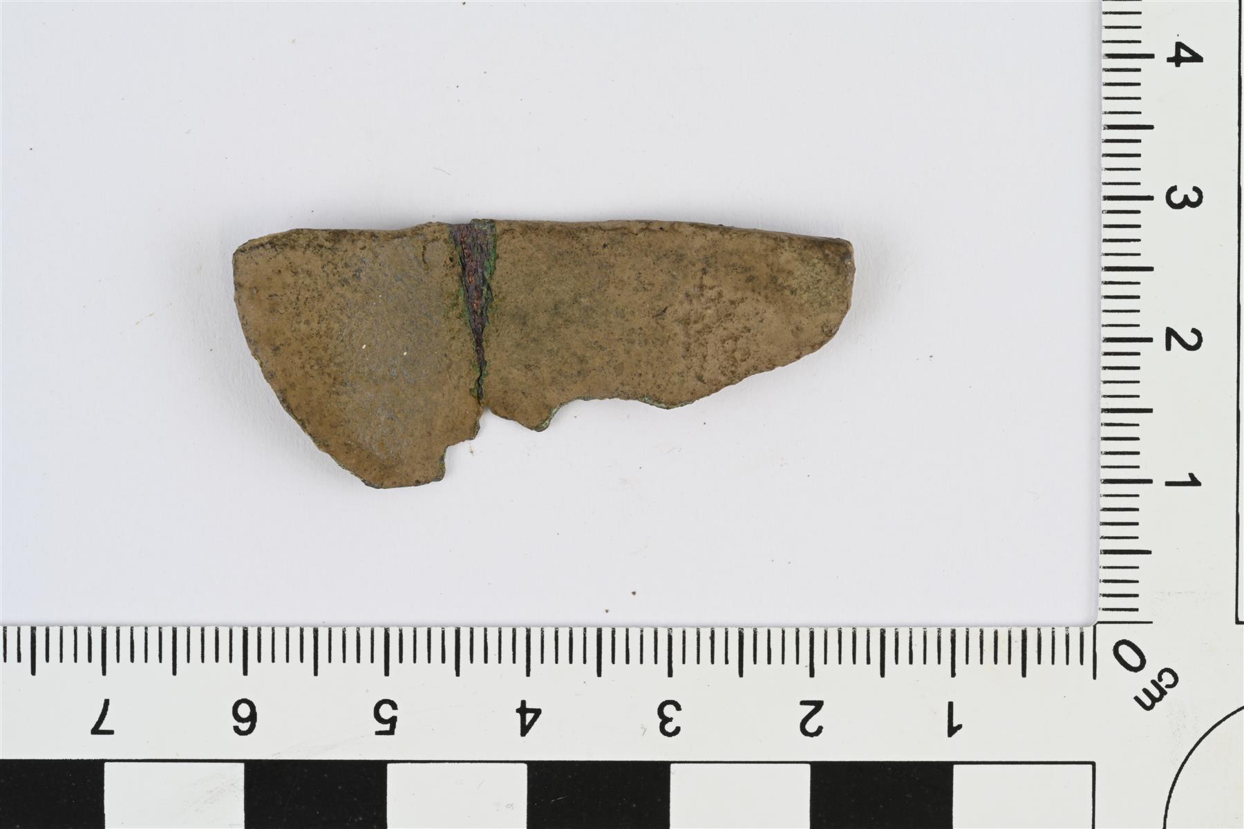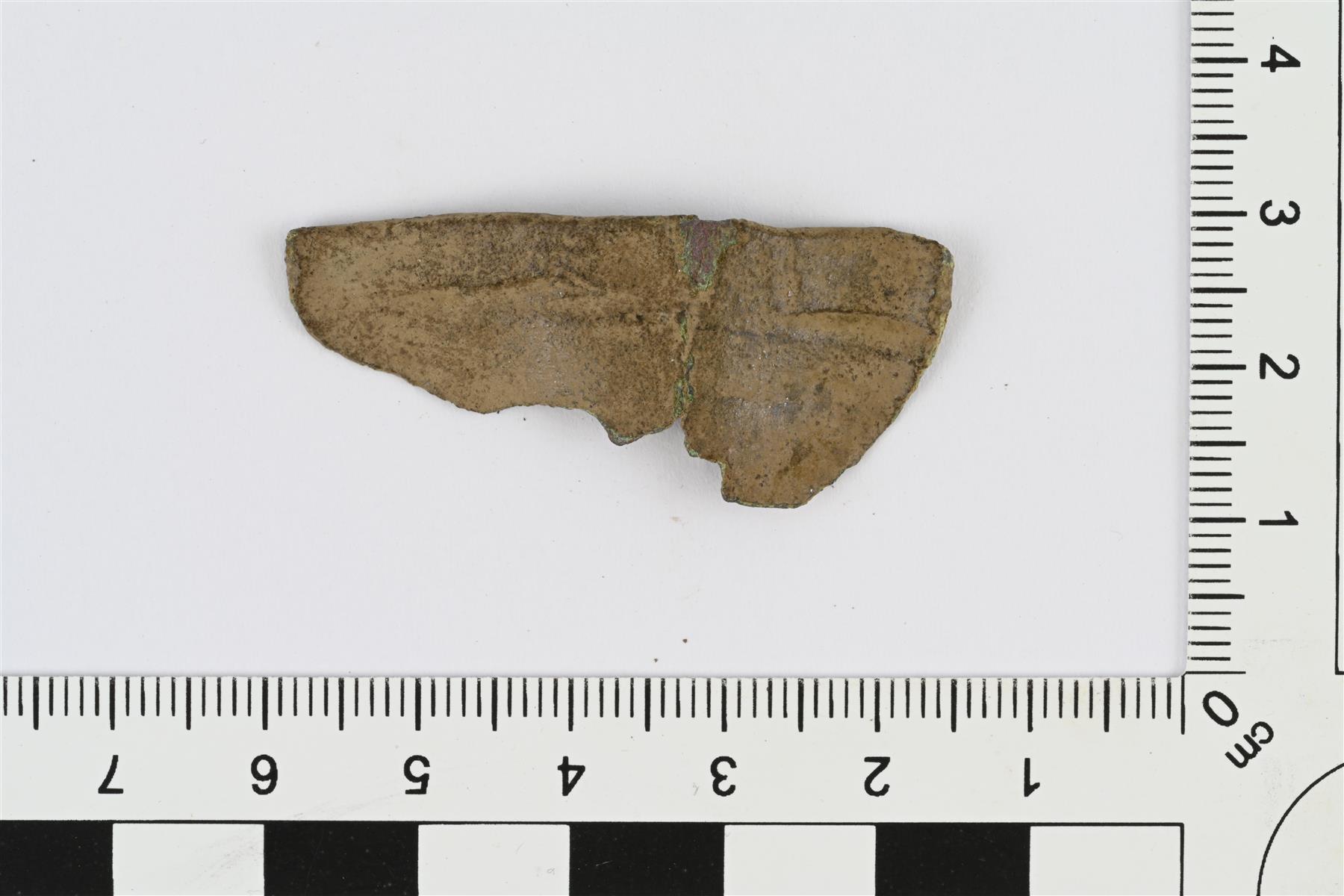 | Kupariseosastian suureunapala. Toisella pinnalla reunan alapuolella leveä matala ura. Vääntynyt, osittain murtunut keskeltä | |