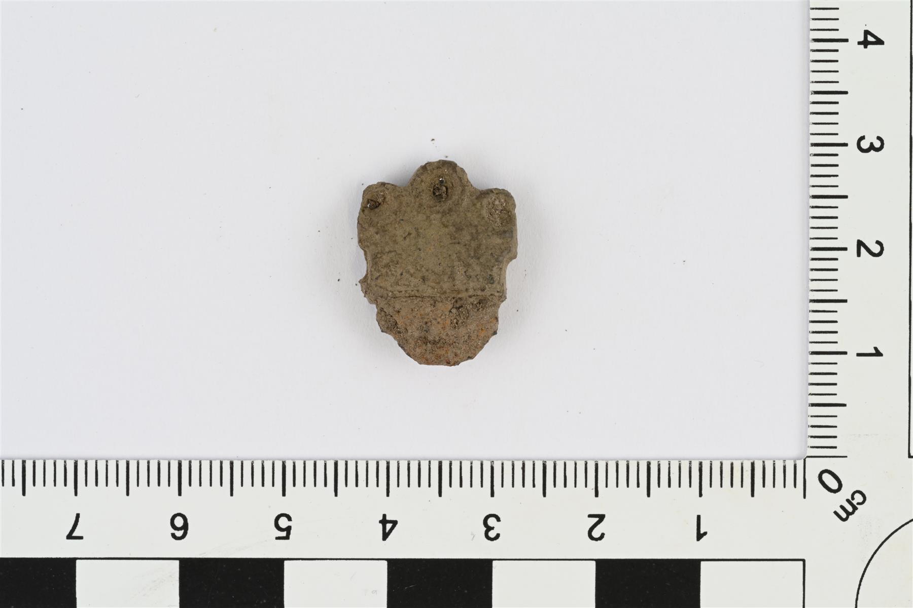 | Pöytäveitsen ylähela. Poikkileikkaus soikea, yläreunaan litistyvä. Yläreunassa rivissä kolme rengasmaista ulkonemaa, joista keskimmäinen korkeammalla kuin reunimmaiset. Alareunassa jäljellä jäännettä veitsen leveästä litteästä kahvaruodosta. | |