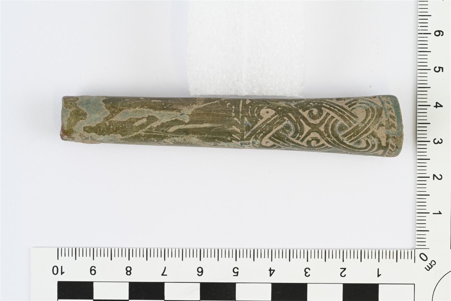 | Punoskoristeinen veitsenkahva. Toiseen päähän hieman levenevä kupariseosputki, jonka sisällä rautaa veitsen ruodosta. Poikkileikkaus kapeammassa, veitsen terän puoleisessa päässä lähes pyöreä, halkaisija 12-12,5 mm. Leveämpää päätä kohti kahvan sivuille muodostuu selvät taitteet, ja poikkileikkaus leveässä päässä on päihin suippeneva soikio. Kahvan leveämmässä päässä on punoskoristelua, joka kattaa noin puolet kahvan pituudesta. Kummallakin taitteiden väliin jäävällä sivulla on nauhapunoskuviot, jotka ovat keskenään samanlaiset. Punoksessa kulkee kolme rinnakkaista nauhaa. Kuvion keskelle muodostuu vinoneliö ja päihin sydäntä muistuttavat kuviot. Punoskuvion ylä- ja alapuolella sekä kahvan terän puoleisessa päässä poikittaiset koristeraidat, joissa kahden kohovyön välissä rivi pieniä vinoviivoja. | |