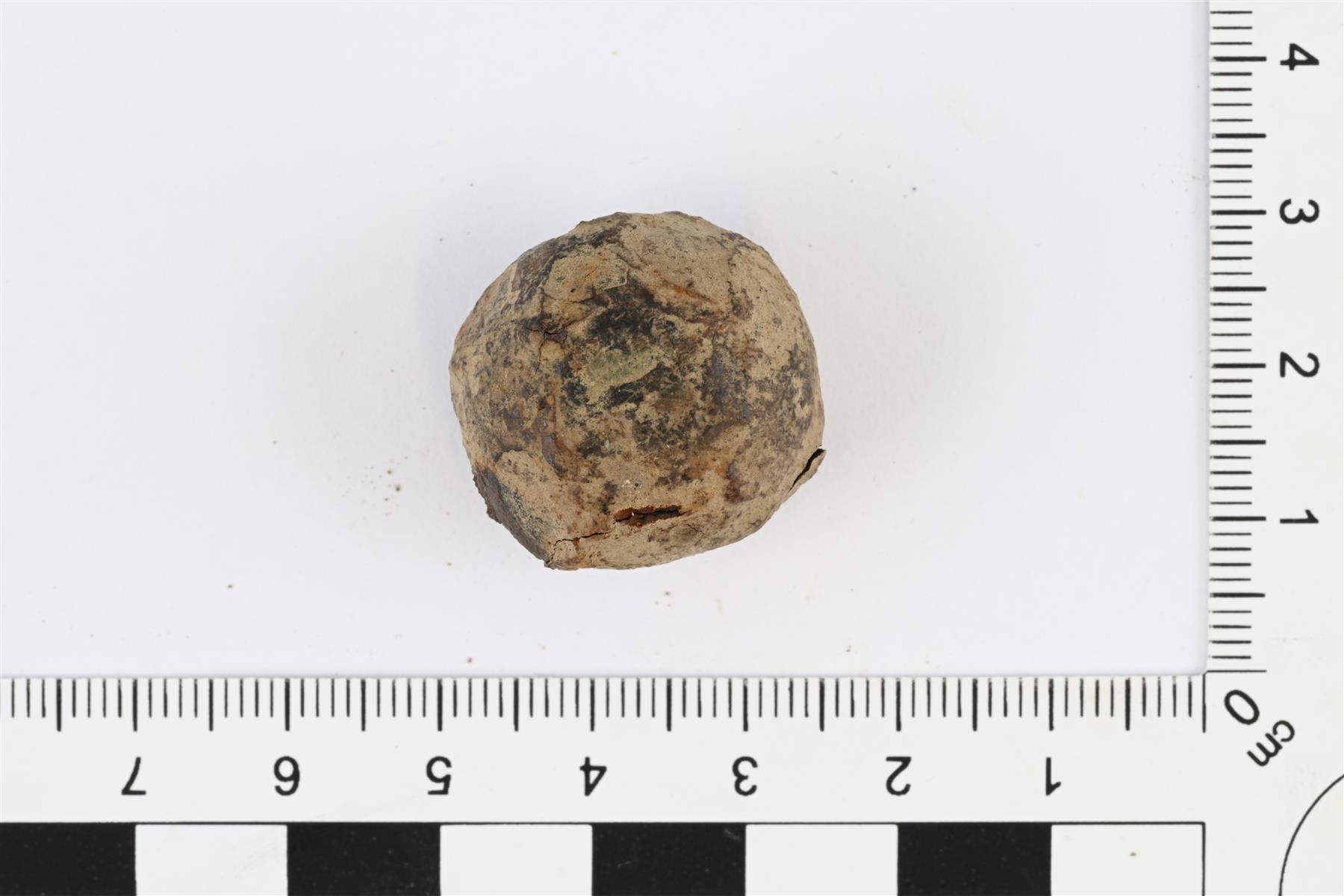 | Kuulamainen punnus. Kupariseosvaippa ja rautaydin. Rauta korrodoitunut ja paikon rikkonut kupariseospinnan. | |