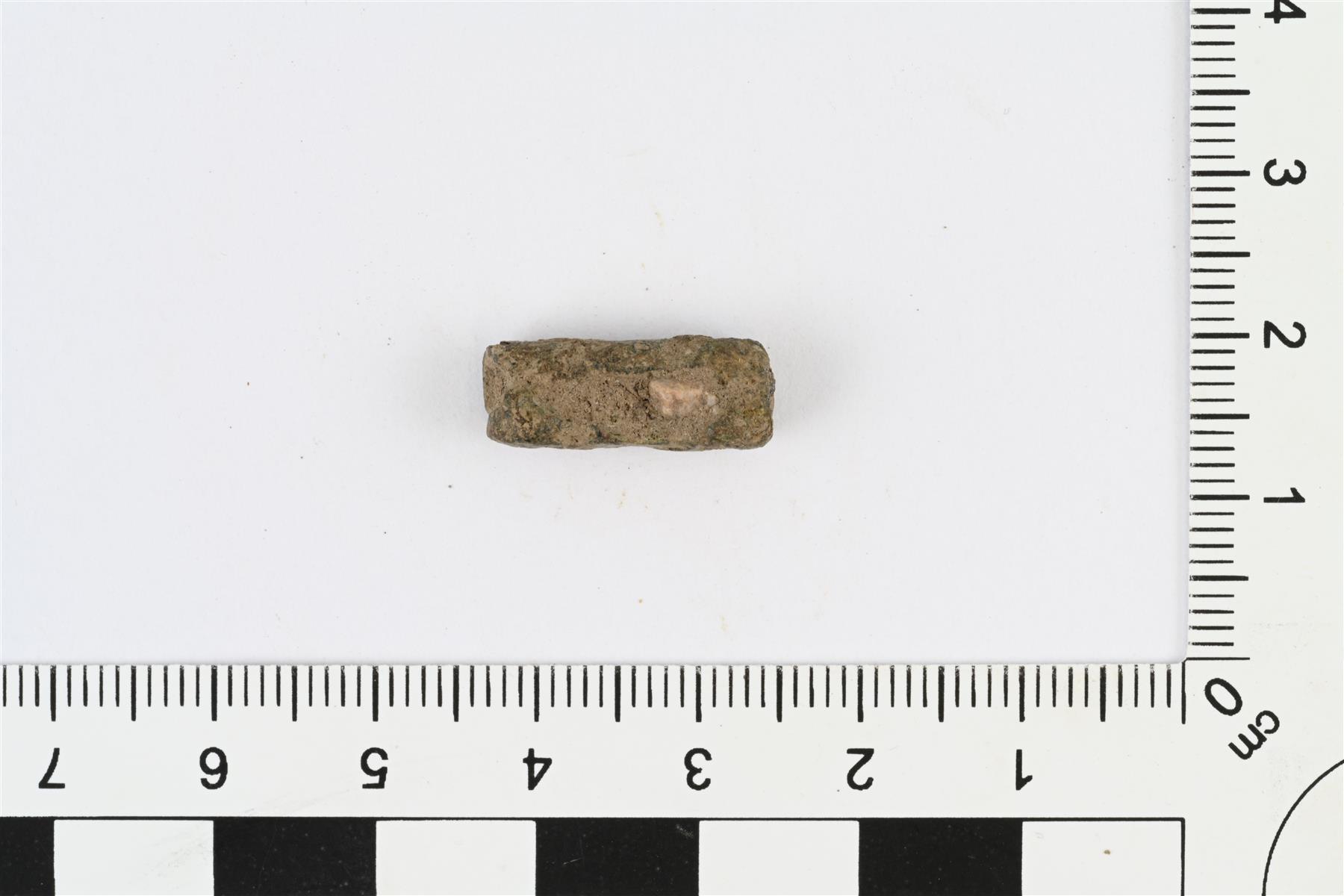 | Kolmijakoinen sarjahelmi. Poikkileikkaus neliönmuotoinen. Pinnat kulunet ja osittain murtuneet. | |