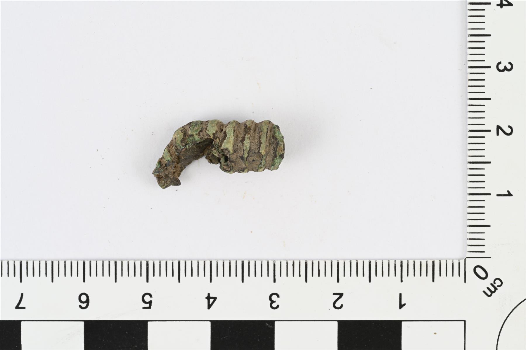 | Putkimaiseksi spiraaliksi kierrettyä kupariseosvarrasta. Vartaan sisäpinta tasainen ja ulkopinta harjava. Mahdollisesti kaarisoljesta. Putken halkaisija 8 mm, vartaan leveys n. 2 mm. Osittain sulanut. | |
