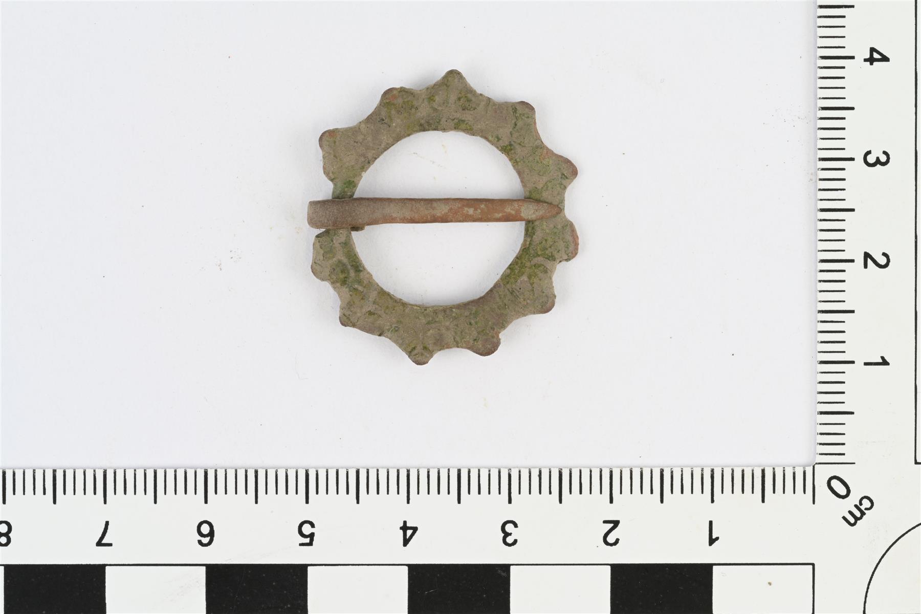 | Pyöreä koristeltu kehäsolki. Poikkileikkaukseltaan litteä. Ulkokehällä 11 kpl pieniä pyöristetyn kolmion muotoisia nystyröitä tai "sakaroita". Kehässä kahden sakaran välissä kavennettu kohta, johon poikkileikkaukseltaan litteän neulan tyvi on kierretty. Etupuolella kulunutta ja epäselvää reliefikoristelua. Paksuus mitattu neulan tyven kohdalta. Kehän paksuus 1,5 mm. | |