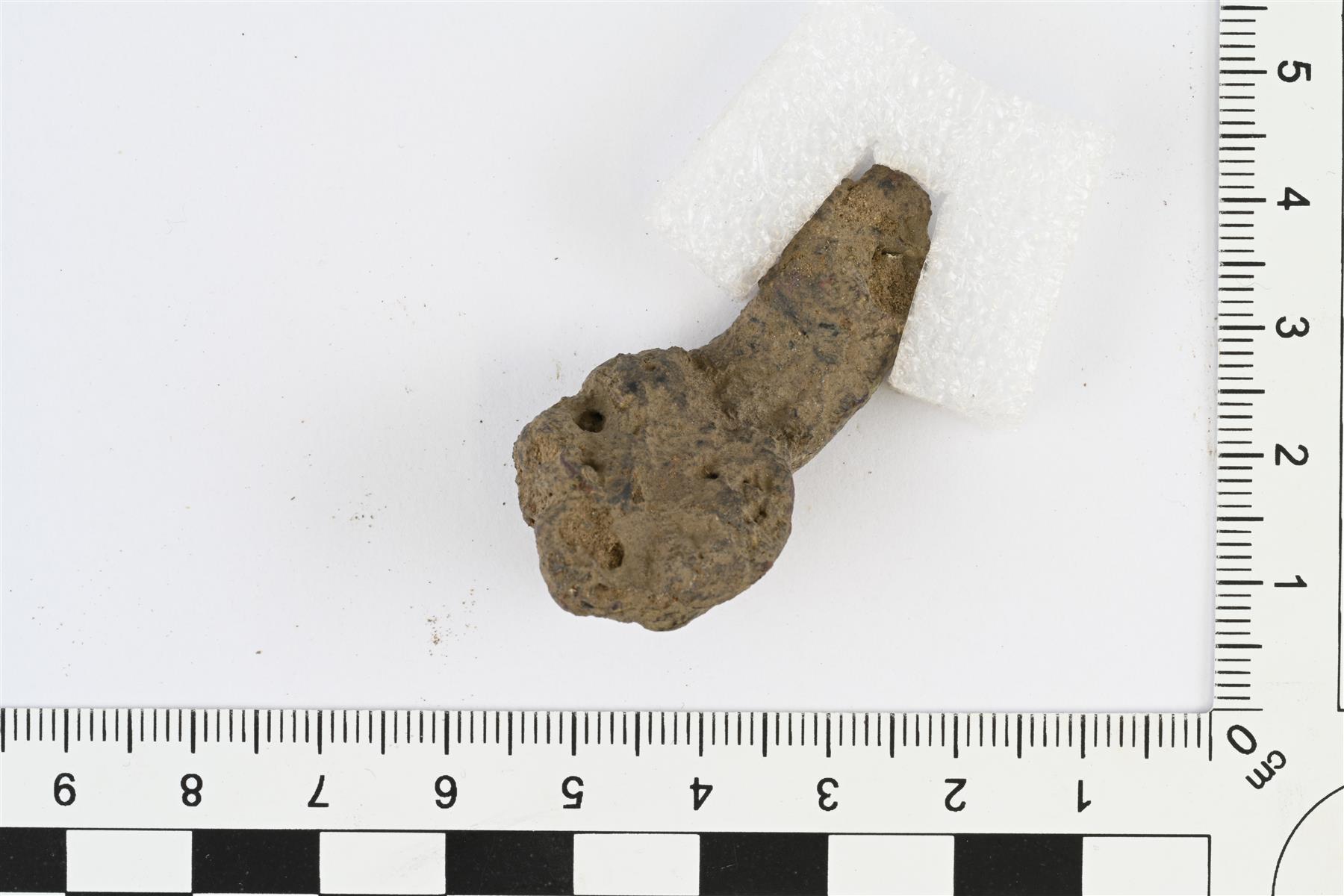 | Särmänuppisen hevosenkenkäsoljen katkelma, jossa yksi nuppi ja osa kaarta. Sekä nuppi että kaari massiiviset ja raskastekoiset. Osittain sulanut. | |