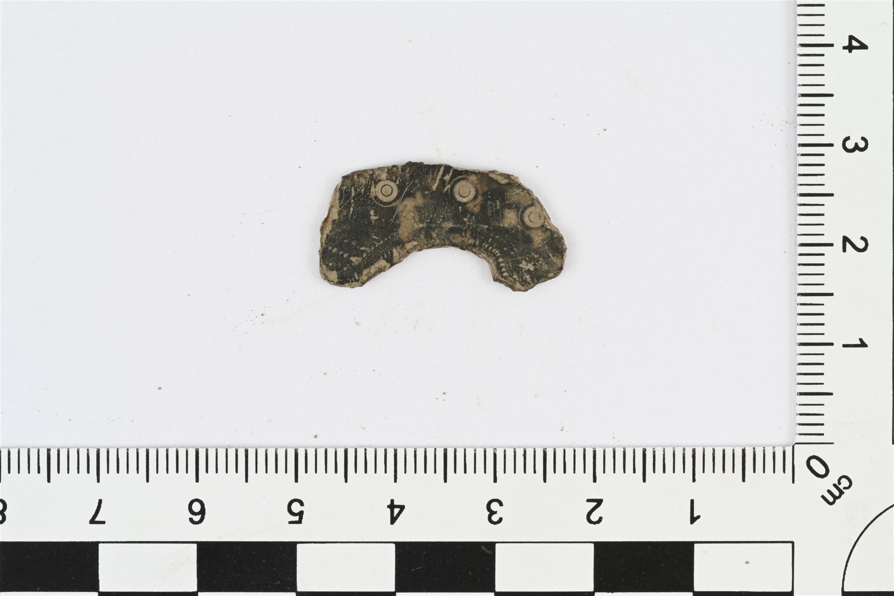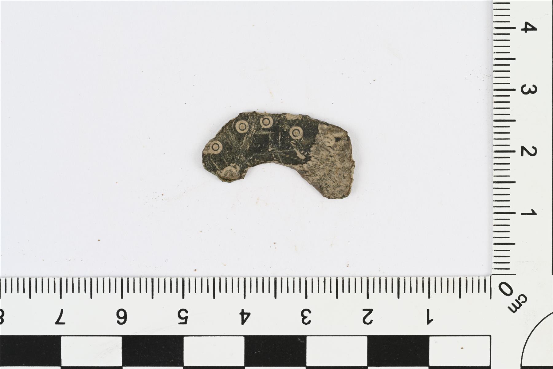 | Litteä koristeltu kupariseoskatkelma. Pitkänomainen, toinen reuna kupera ja toinen kovera. Koveraa reunaa reunustaa molemmilla pinnoilla pisteviivat, joten reuna lienee alkuperäinen. Kupera reuna ainakin osittain murtunut. Molemmilla pinnoilla häränsilmäleimoja. | |