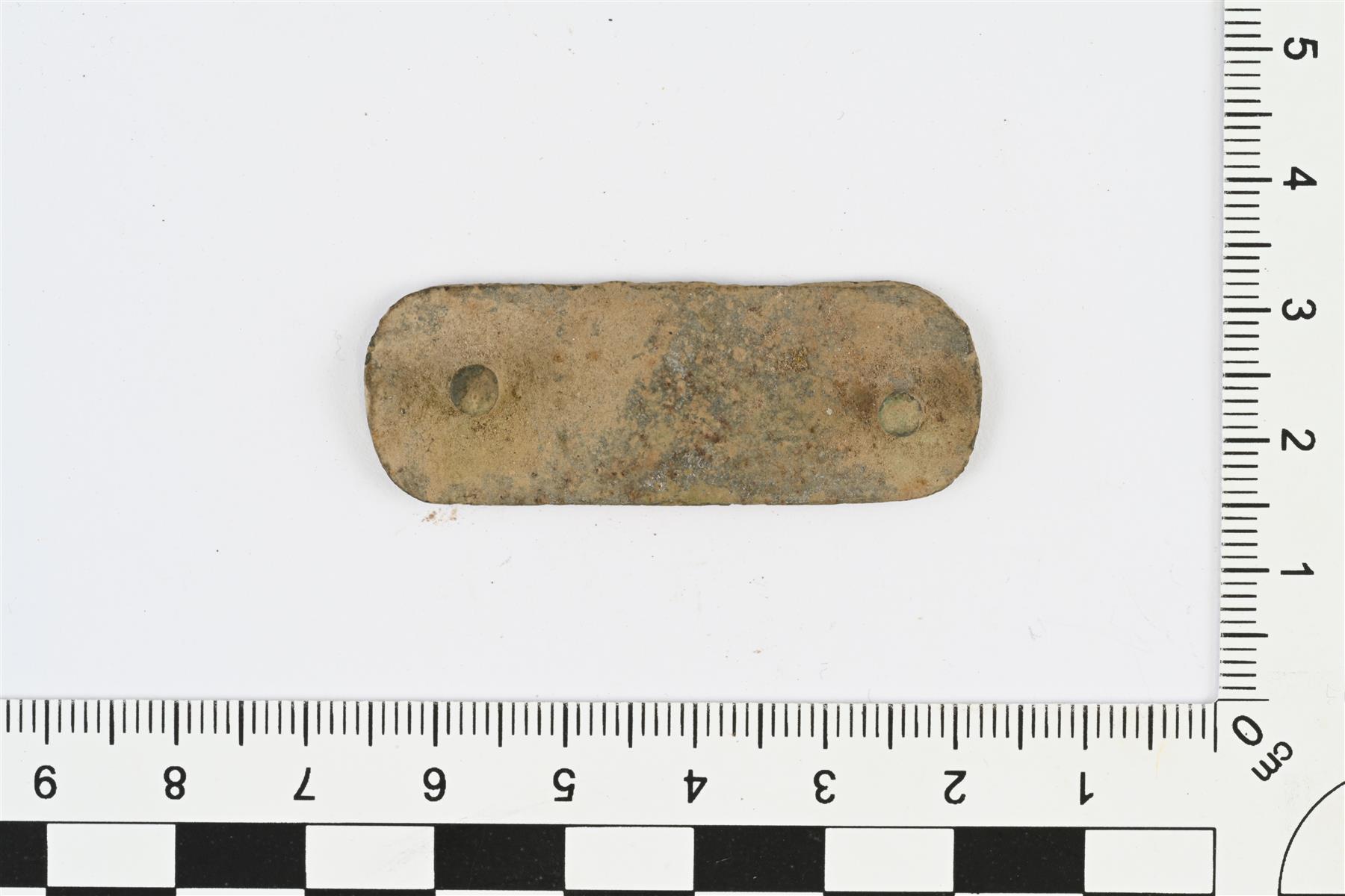 | Hela tai mahdollisesti valjaskoriste. Kulmistaan pyöristetyn suorakulmion muotoinen levy, jonka taustapuolella molemmissa päissä kiinnitystappi. Kupariseosta, etupuolella mahdollisesti jälkiä hopeoinnista. Paksuus mitattu kiinnitystappien kohdalta, levyn paksuus 1,5 mm. | |