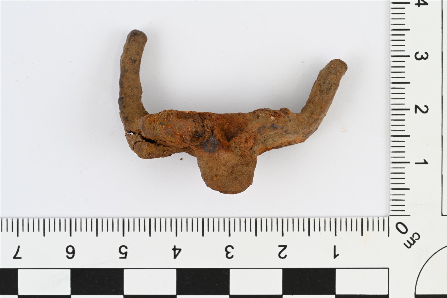 | Kaksipiikkinen hevosen viskari, rautaa. Kahdeksikon muotoinen levy, jonka keskellä toisella puolella kohoava ja suippeneva jäänasta. Levyn toisella puolella sen päissä ohuet taipuvat varret. Levyn reuna osittain murtunut. Vrt. Kivikoski 1973, Taf. 110, Abb. 996. | |
