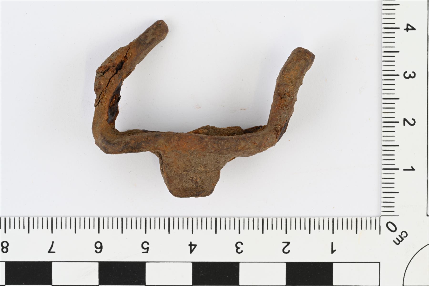 | Kaksipiikkinen hevosen viskari, rautaa. Kahdeksikon muotoinen levy, jonka keskellä toisella puolella kohoava ja suippeneva jäänasta. Levyn toisella puolella sen päissä ohuet taipuvat varret. Levyn reuna osittain murtunut. Vrt. Kivikoski 1973, Taf. 110, Abb. 996. | |