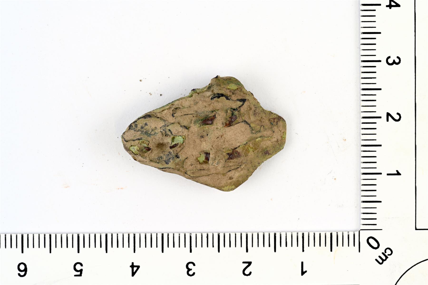| Tasavartisen soljen päätykatkelma. Keskellä ja sivuilla on koristeena lyhyet tapit. Lisäksi yksinkertaista viivaornamentiikkaa. Jousilaitteen kiinnityslenkit ja ketjua varten tehty lenkki päädystä ovat hajonneet. Vrt. Kivikoski Abb. 679. | |