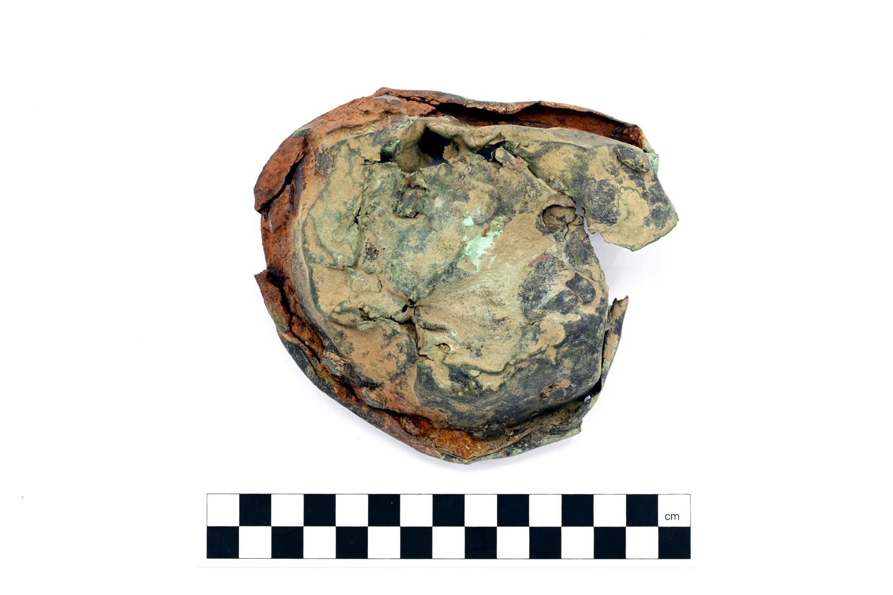 | Osittain kasaan painunut ja rikkoutunut kupariseosastia. Tehty niittaamalla ohuita peltilevyjä yhteen ja niittejä on käytetty hyvin runsaasti. Reuna on rullattu ulospäin ja taitteen sisäpuolella näyttäisi olevan säilyneenä ulkoreunan tukena toiminut rautavanne. Alun perin astia on ollut matala ja melko pienikokoinen. | |