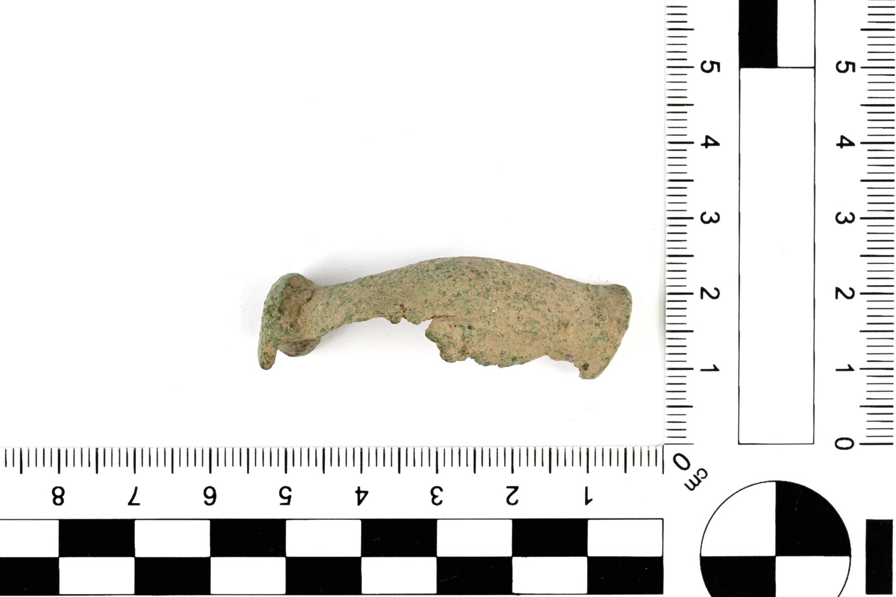 | Vääntynyt ja rikkoutunut tasavarsisolki. Neulakota ja jousilaitteen kiinnityslenkki ovat hajonneet. Pinta on hyvin huonokuntoinen ja koristelua ei voi erottaa. | |