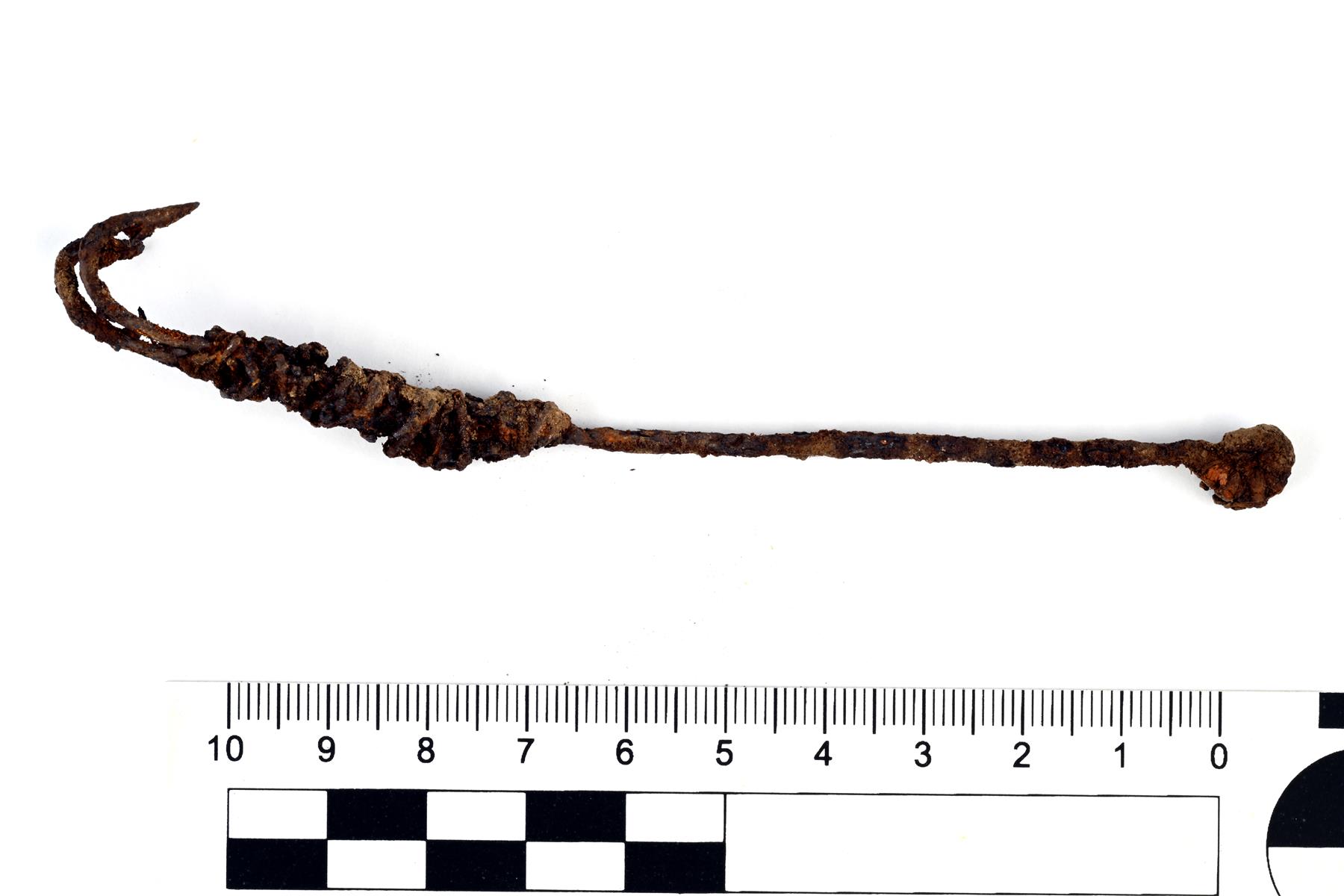 | Pitkänomainen ongenkoukku, jonka päässä on kaksi koukkua. Yläpään ympärille on myös kierretty jonkinlaista nyöriä. | |