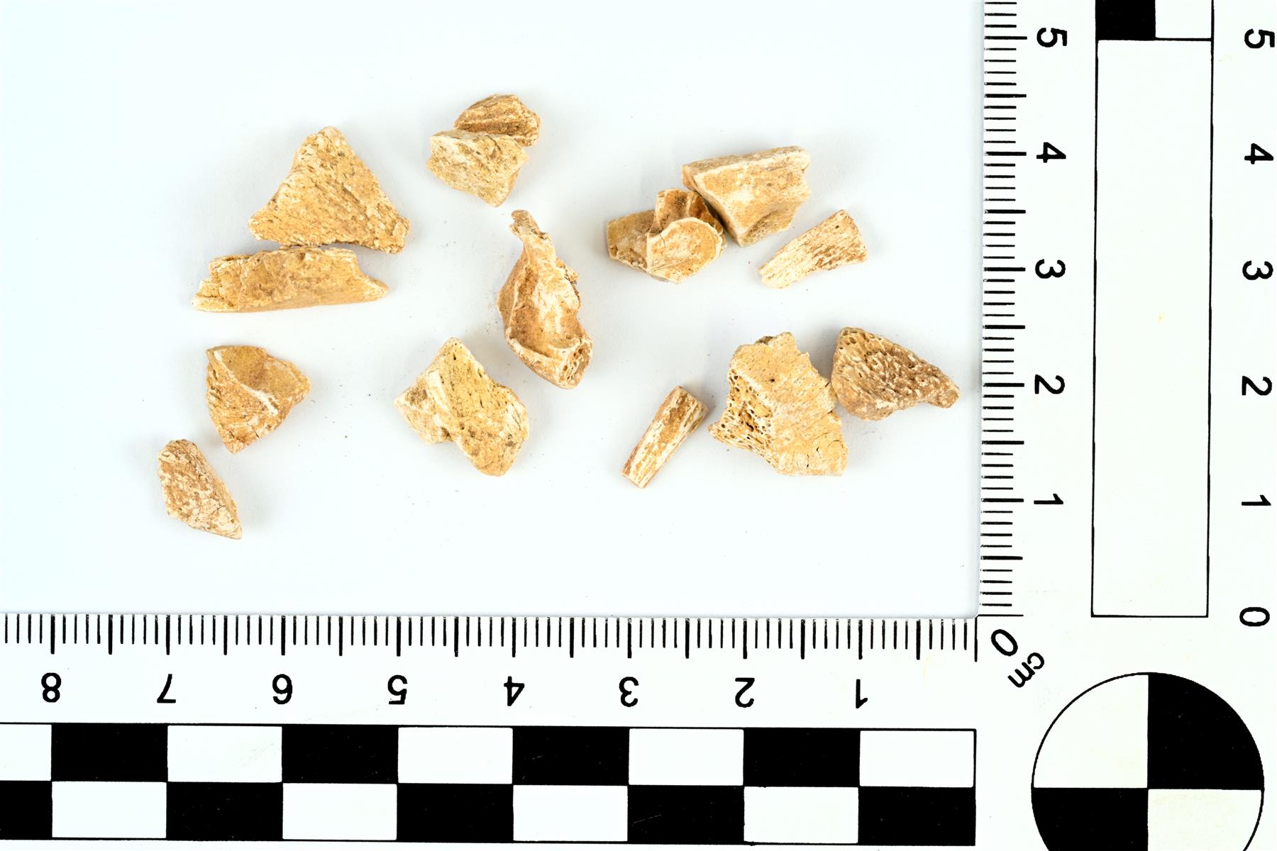 | Pieniä palaneiden luiden paloja. Pääasiassa putkiluista. | |