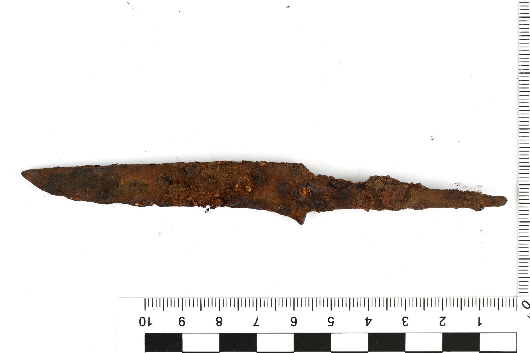 | Piiloruotoinen ja suorahamarainen veitsi. Hamara on leveä. Terä on melko kulunut. | |