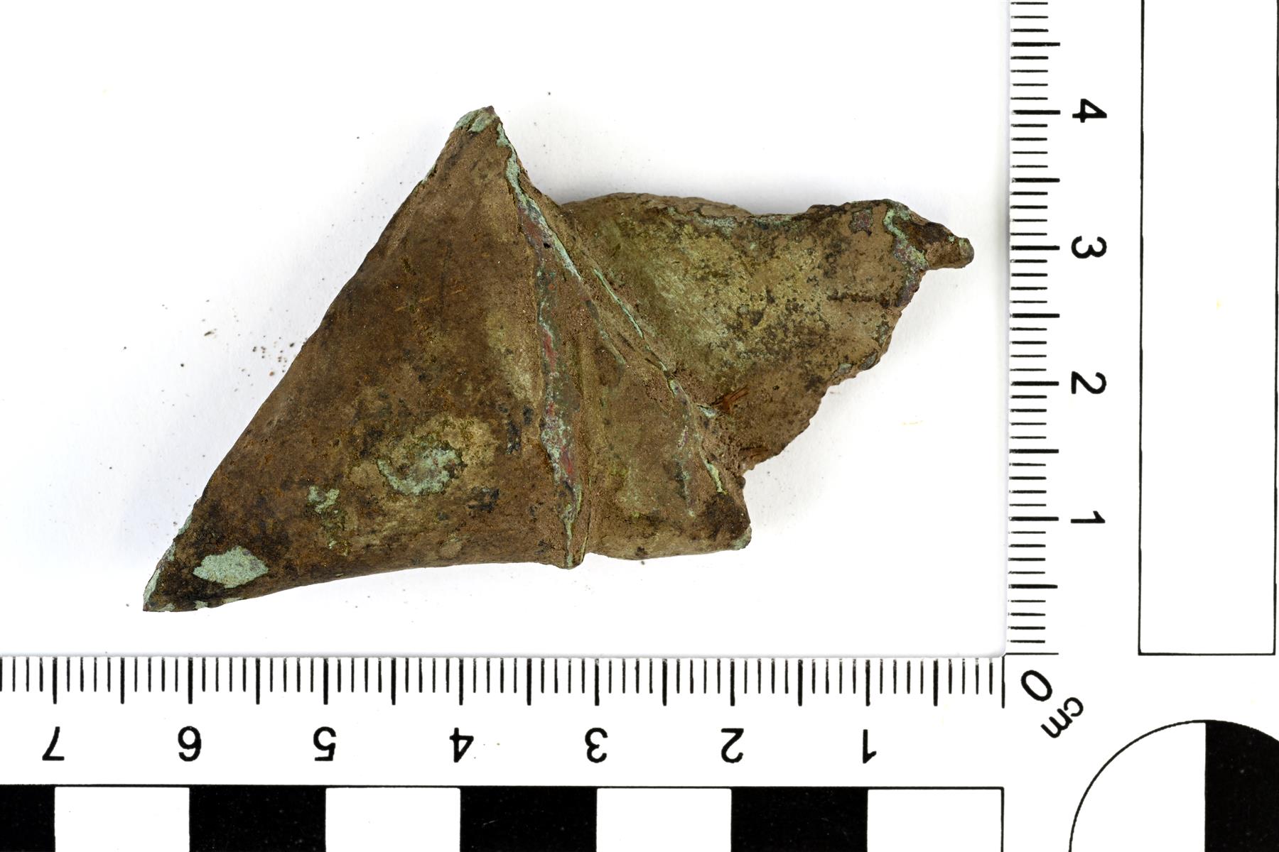 | Rullalle taitettu kupariseoslevy. Jussi Moisio 27.7.2023 KM45136:3_1_kuparilevy |