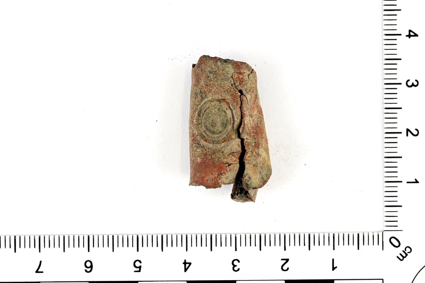 | Pellistä taivutettu helankaltainen esine. Koristeluna on sisäkkäisiä kehäkuvioita. Sisäpuolella on säilyneenä hiiltä. | |