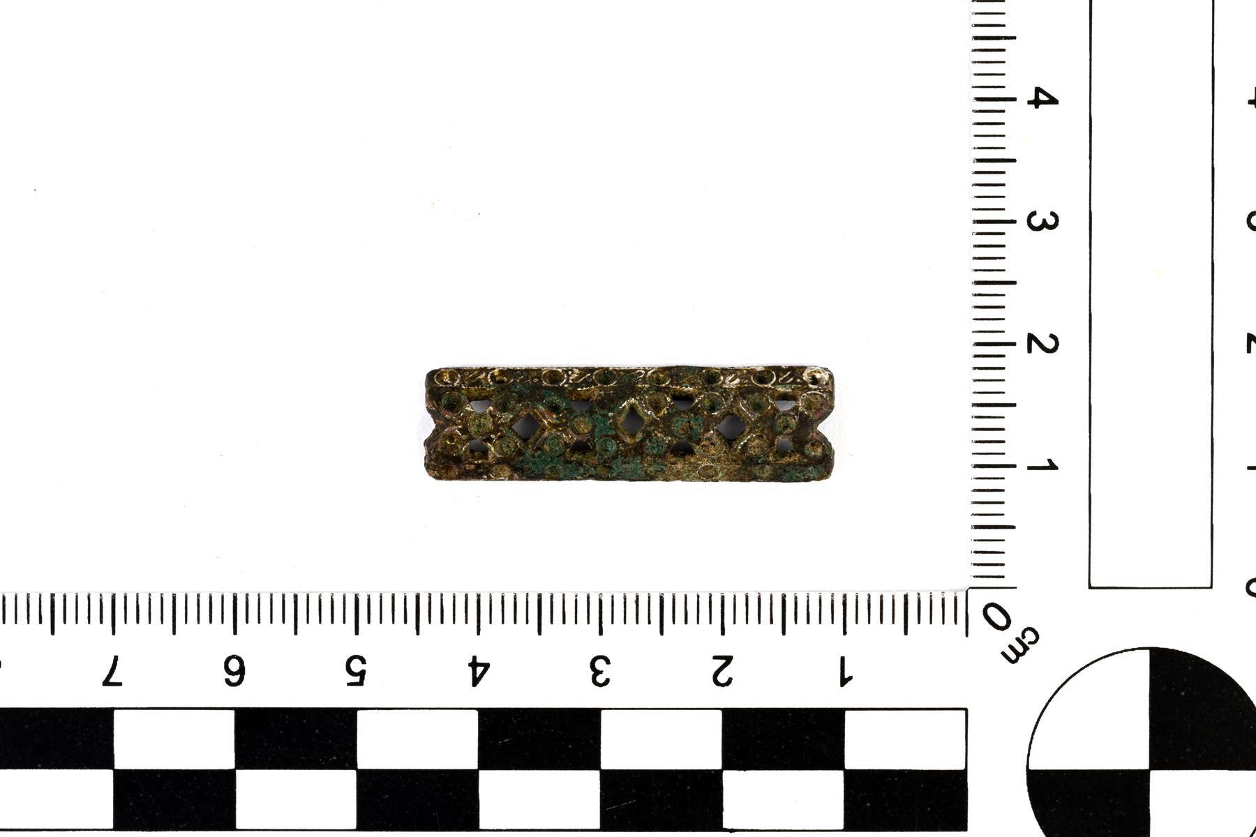 Hopeoitu kupariseoshela. Koristeltu vinoneliönmuotoisilla reikäkuvioilla, pyöreillä pisteillä ja viivoilla. | |