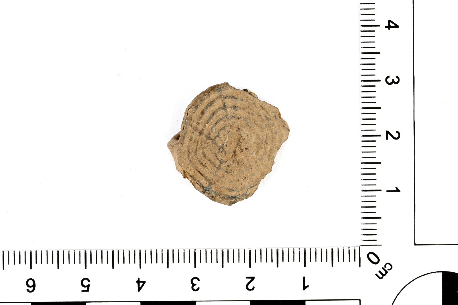 | Pyöreäkantaisen sormuksen katkelma. Kannassa on koristeena sisäkkäisiä kehiä. Edustaa 1500/1600-lukujen talonpoikaista sormusmuotia, vaikka on koristelultaan epätyypillinen. | |
