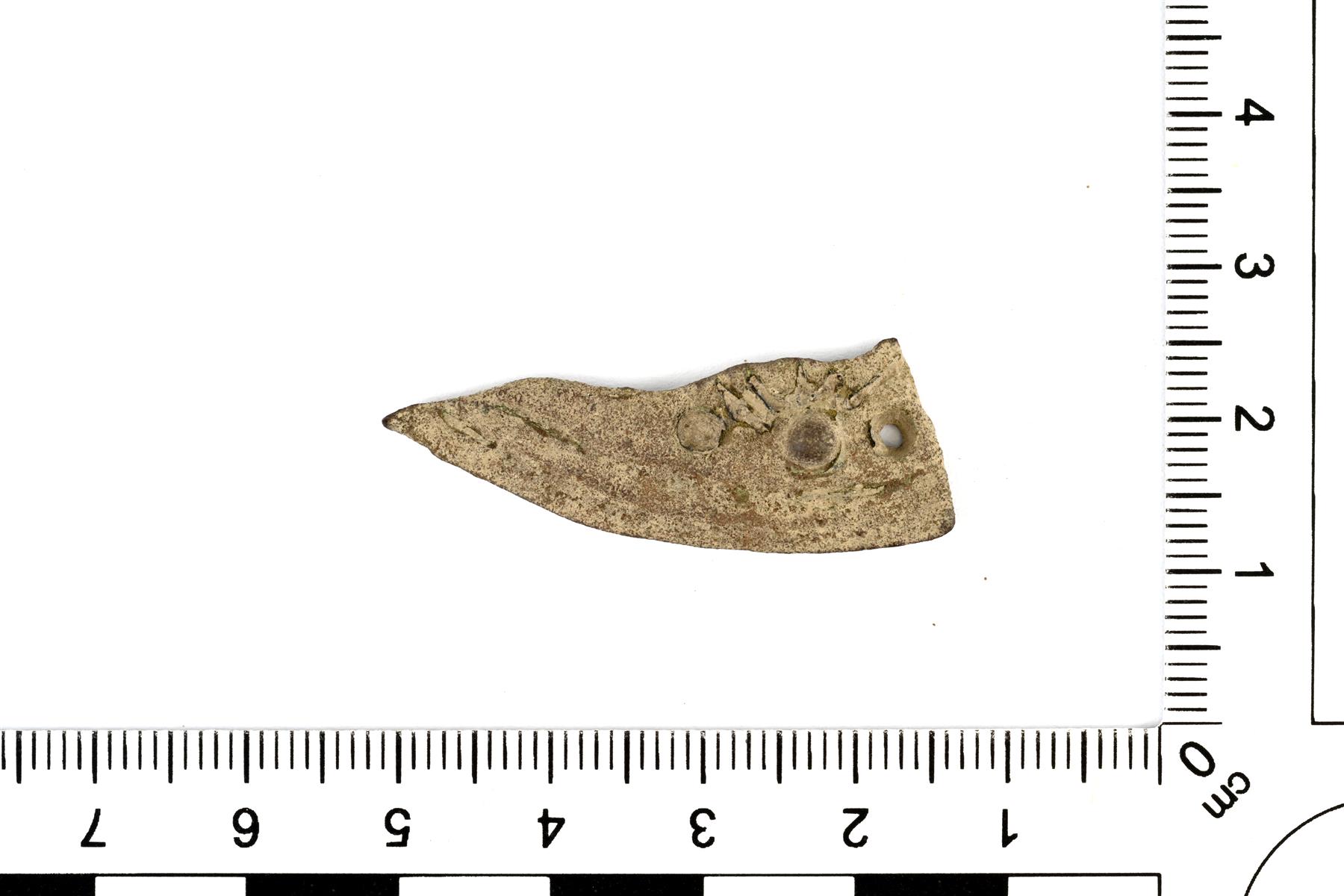 | Pyöreän kupurasoljen reunakatkelma. Reunus on kapea. Koristeluna tappi, pyöreitä kuopanteita ja viivauurteilla tehtyjä nauhakäärmeitä. Vastaa lähinnä C/D- ja D-tyypin solkia. | |
