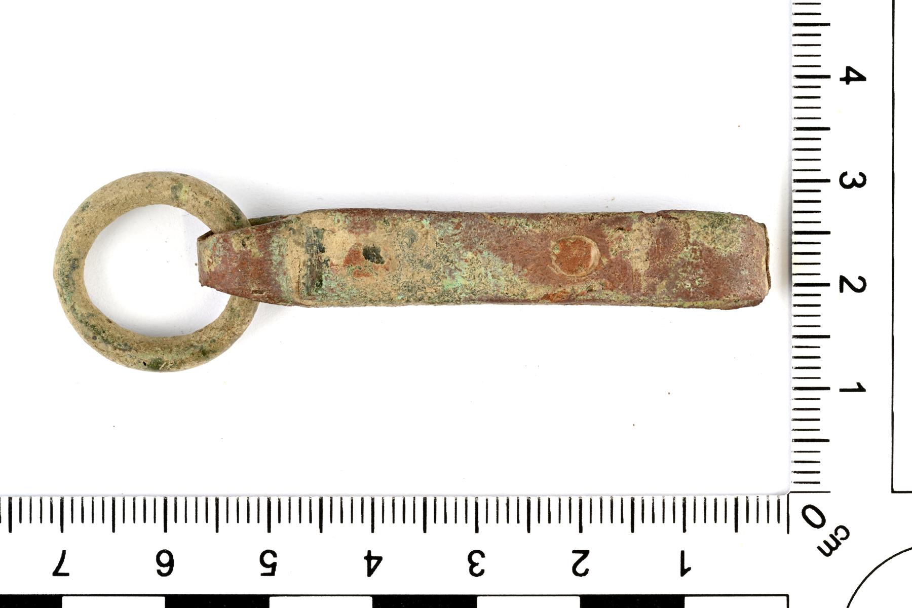 | Suorakaiteenmuotoinen hela. Molemmissa päissä lenkki. Toisessa lenkissä on kupariseosrengas. Keskellä kaksi niittiä. | |