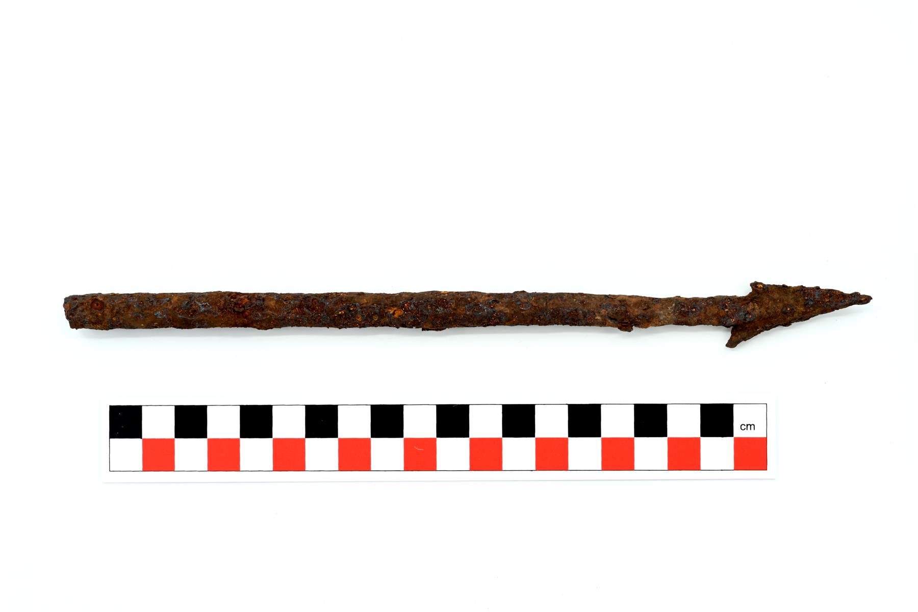 | Pitkänomainen atraimen piikki. Varsi on poikkileikkaukseltaan pyöreä ja kapenee hieman kärkeä kohti. Kärjessä on kaksi väkästä, joista yksi on rikkoutunut. Teränsuiden kohdat ovat tylpät. | |