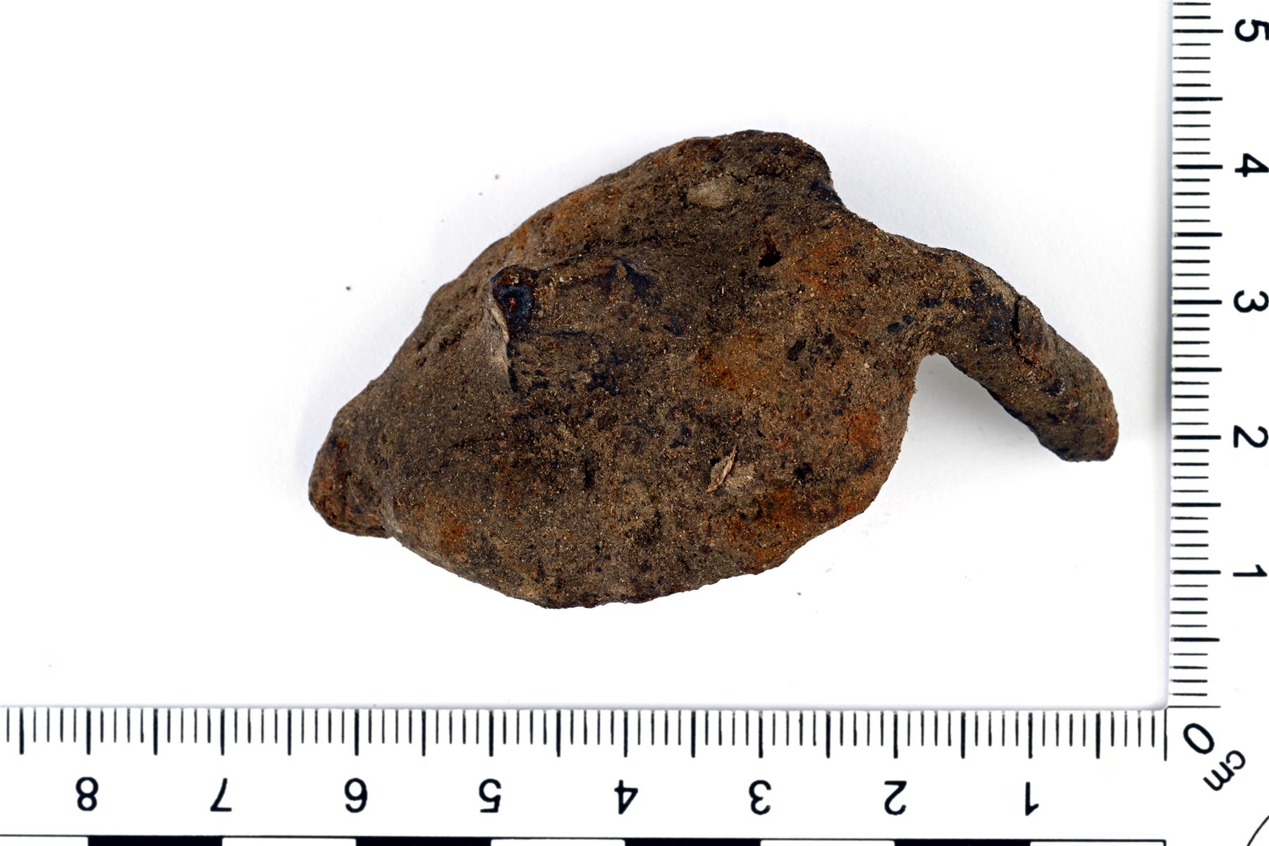 | Kaksipiikkinen viskari. Pohjalevy on muodoltaan ovaali. Yksi piikki on katkennut kokonaan ja toisesta on säilyneenä noin puolet. | |