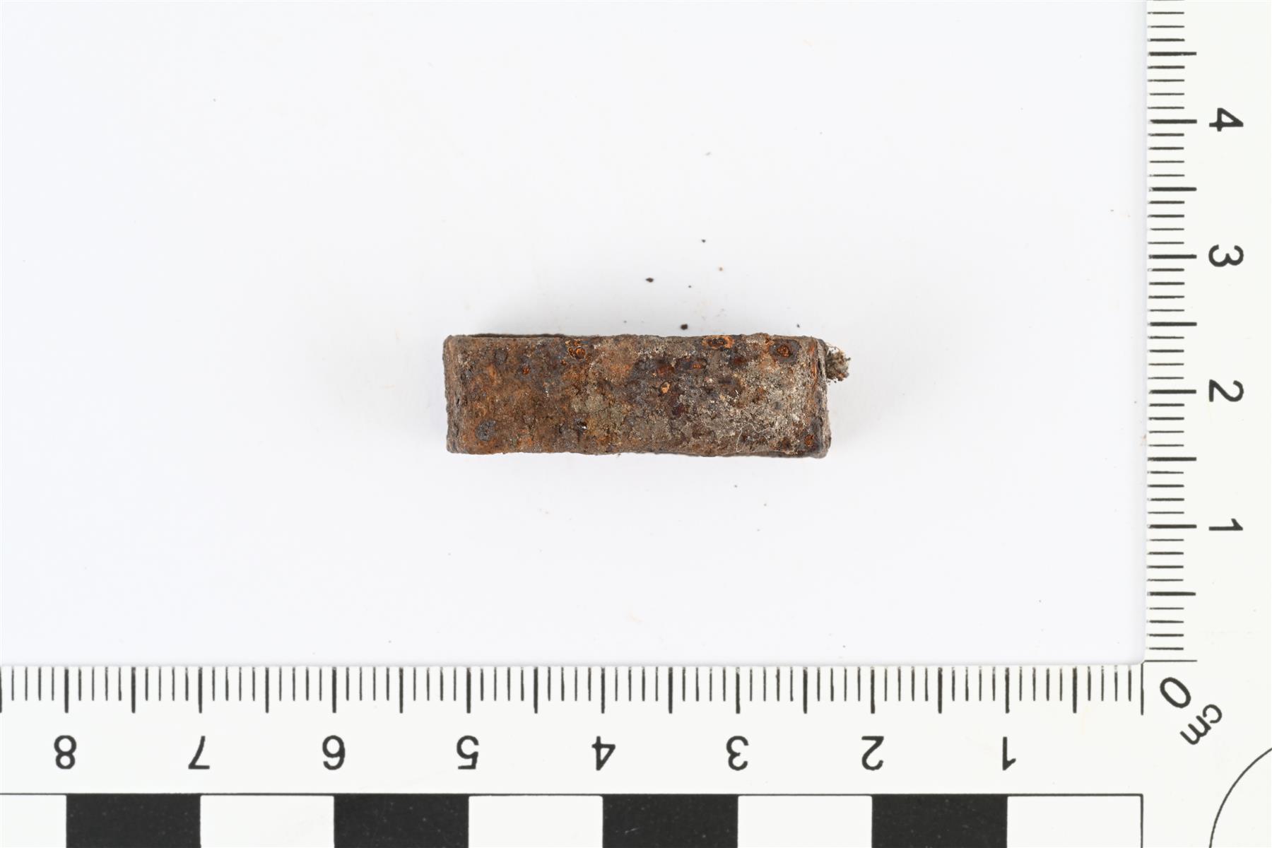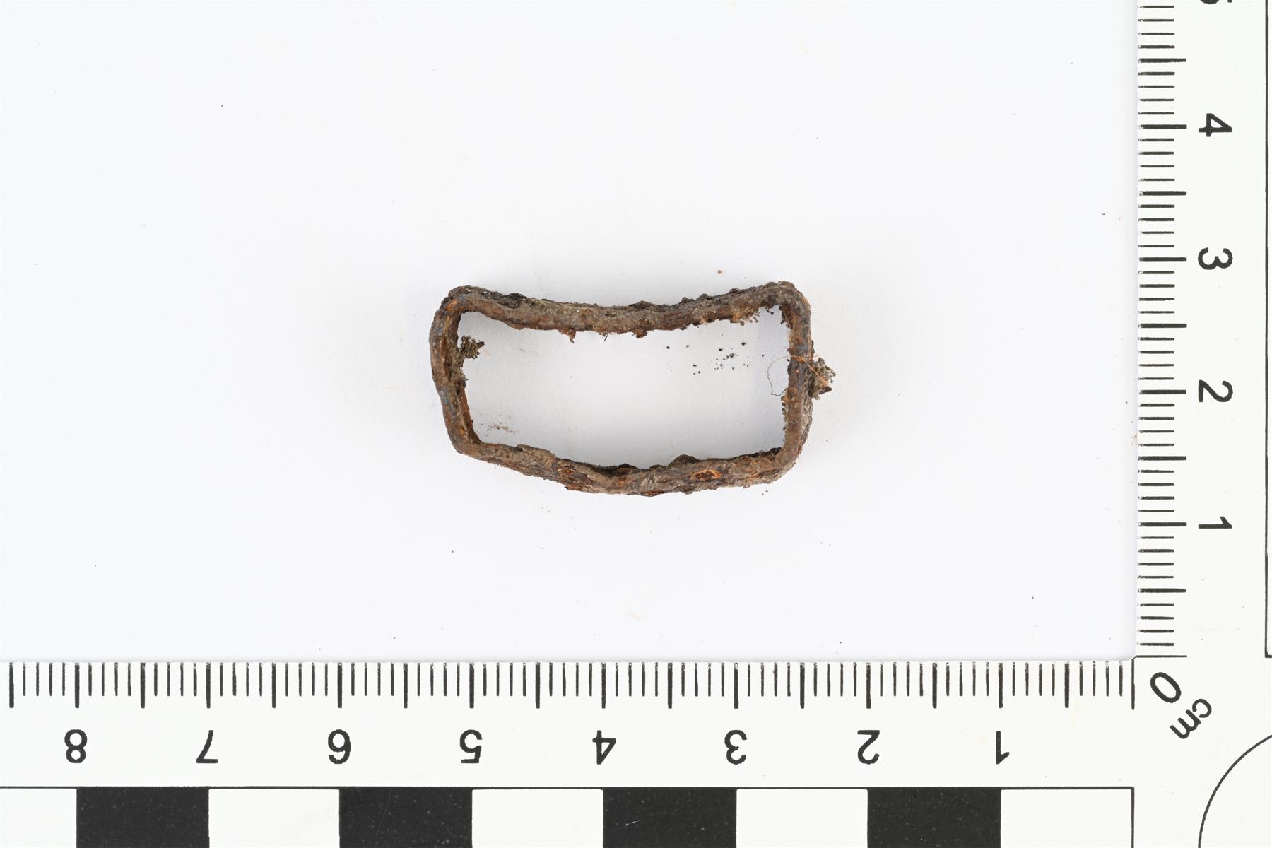 | Kulmikas rautalenkki. Mahdollisesti vyön osa. Umpinainen lenkki, tehty 8 mm levyisestä rautalevyn suikaleesta. Lähes samanlainen kuin KM 45167:5. | |