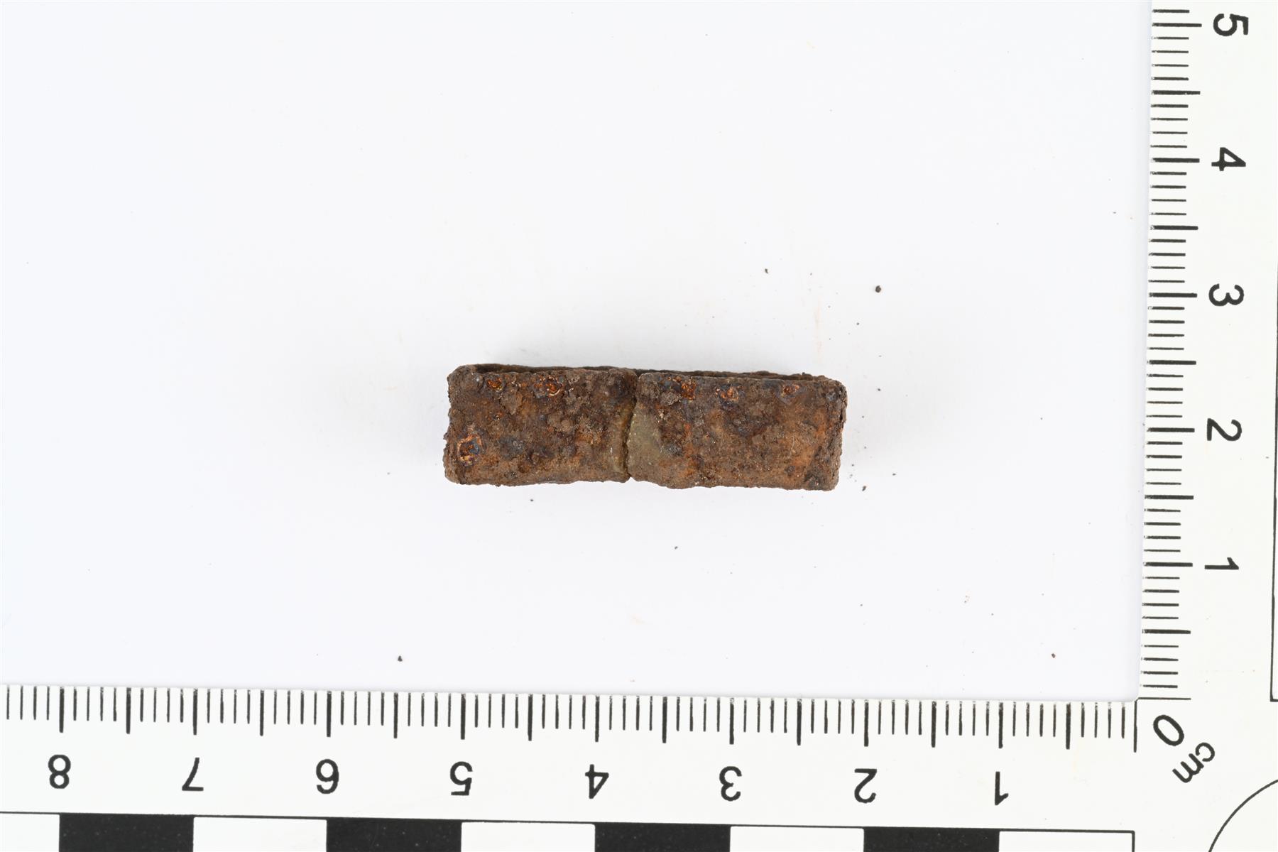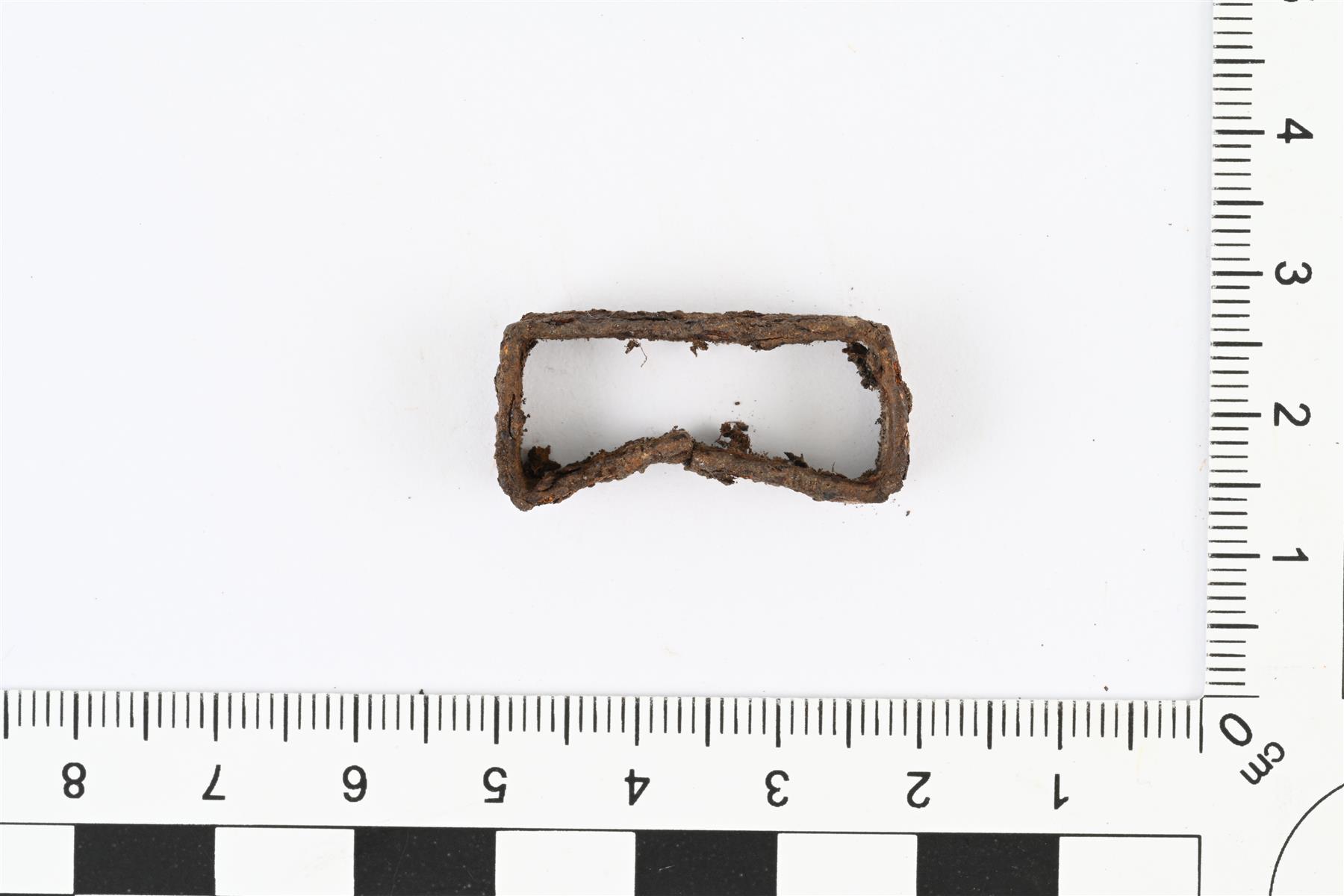 | Kulmikas rautalenkki. Mahdollisesti vyön osa. Avonainen lenkki, tehty 8 mm levyisestä rautalevyn suikaleesta. Suikaleen päät eivät aivan kohdakkain. Lähes samanlainen kuin KM 45167:4. | |