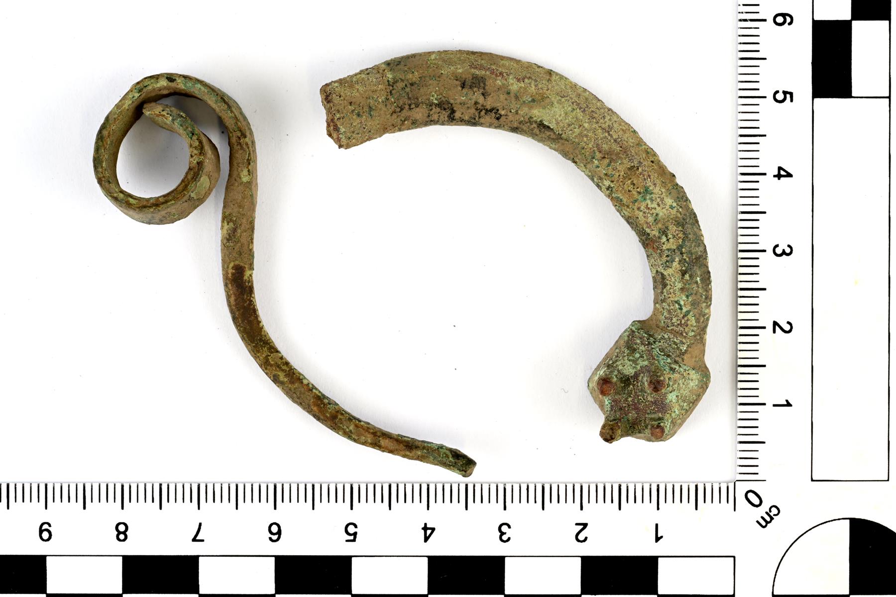 | Tappikoristeisen hevosenkenkäsoljen katkelma ja neula. Jussi Moisio 4.8.2023 KM45173:1_1_tappikoristeinen hevosenkenkäsolki |
