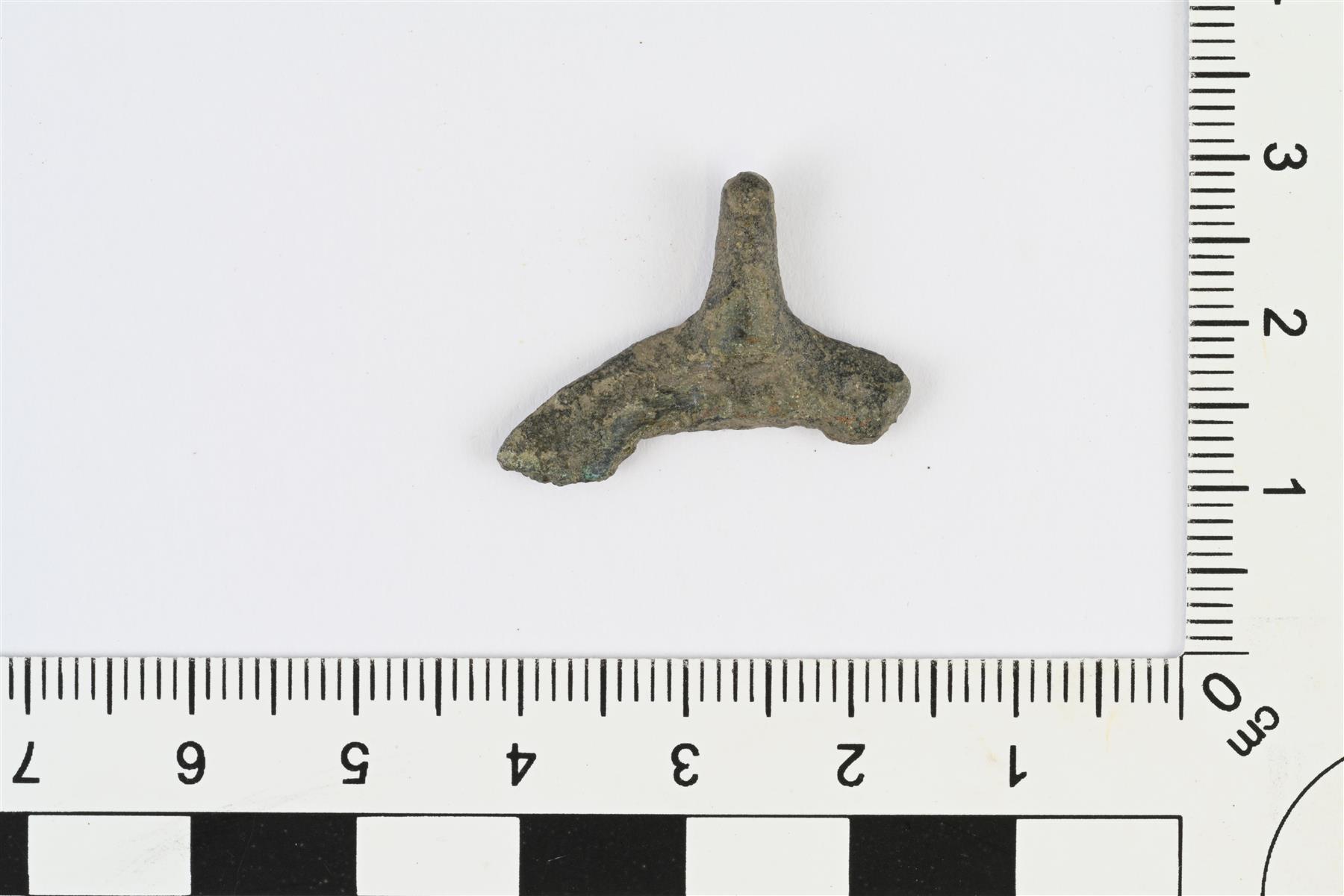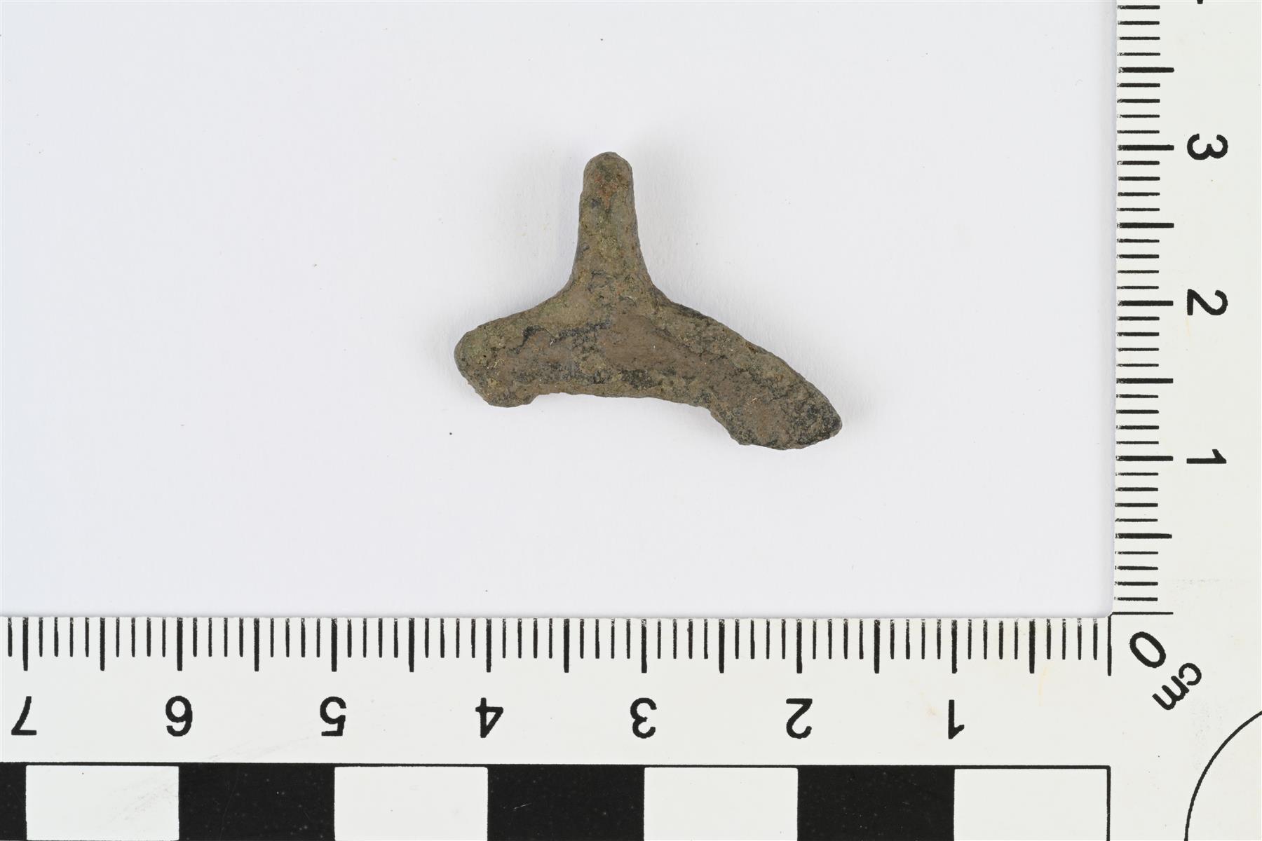 | Kupariseosesineen katkelma. Mahdollisesti rautakautinen. Kaareva pitkänomainen katkelma, jonka toinen pinta hieman kupera ja toinen hieman kovera. Katkelman puolivälistä ulkonee ulkokaaren puolelle poikkileikkaukseltaan pyöreän vartaan katkelma. | |