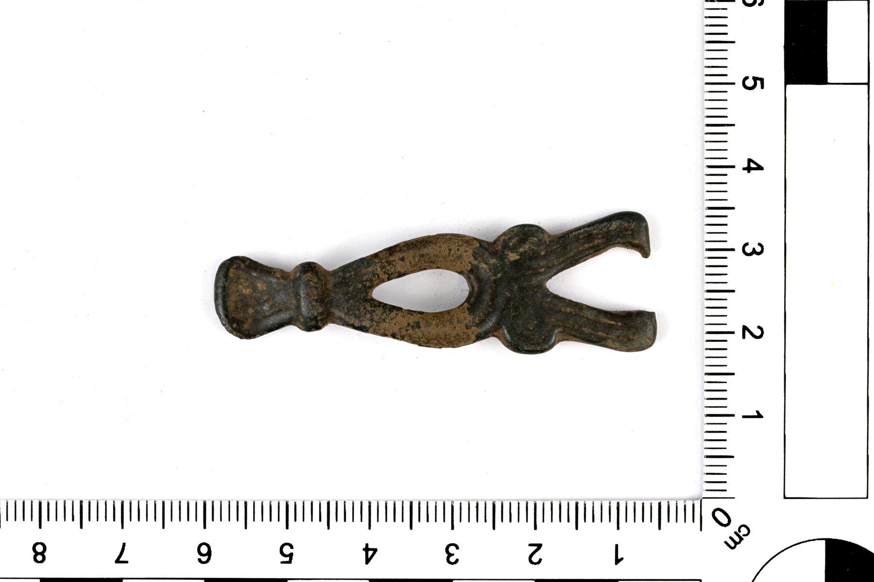 | Puhkonaisin kuvioin koristeltu vyön päätehela. Yläosa puuttuu (sulanut). Ehjässä päädyssä on pyöreähkö levy, jonka yläpuolella on paksunnos. Keskiosa on pisaranmuotoinen ja kehää koristaa sitä kiertävä viivauurre. Rikkoituneessa päädyssä on viivauurteella tehty voluuttimainen koristekuvio ja kehää kiertää viivauurre. Vrt. Kivikoski Abb. 897. | |