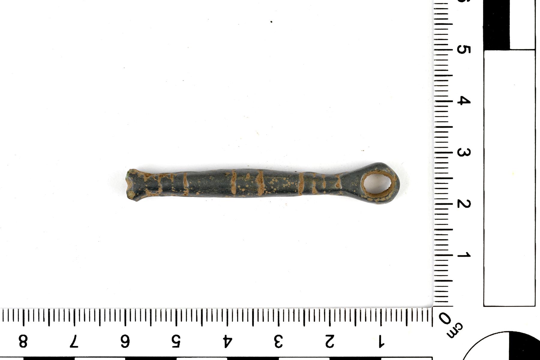 | Toisesta päästä rikkoutunut kankiketjun nivel. Keskiosan poikkileikkaus on pyöreä. Koristeltu poikittaisilla viivauurteilla. | |