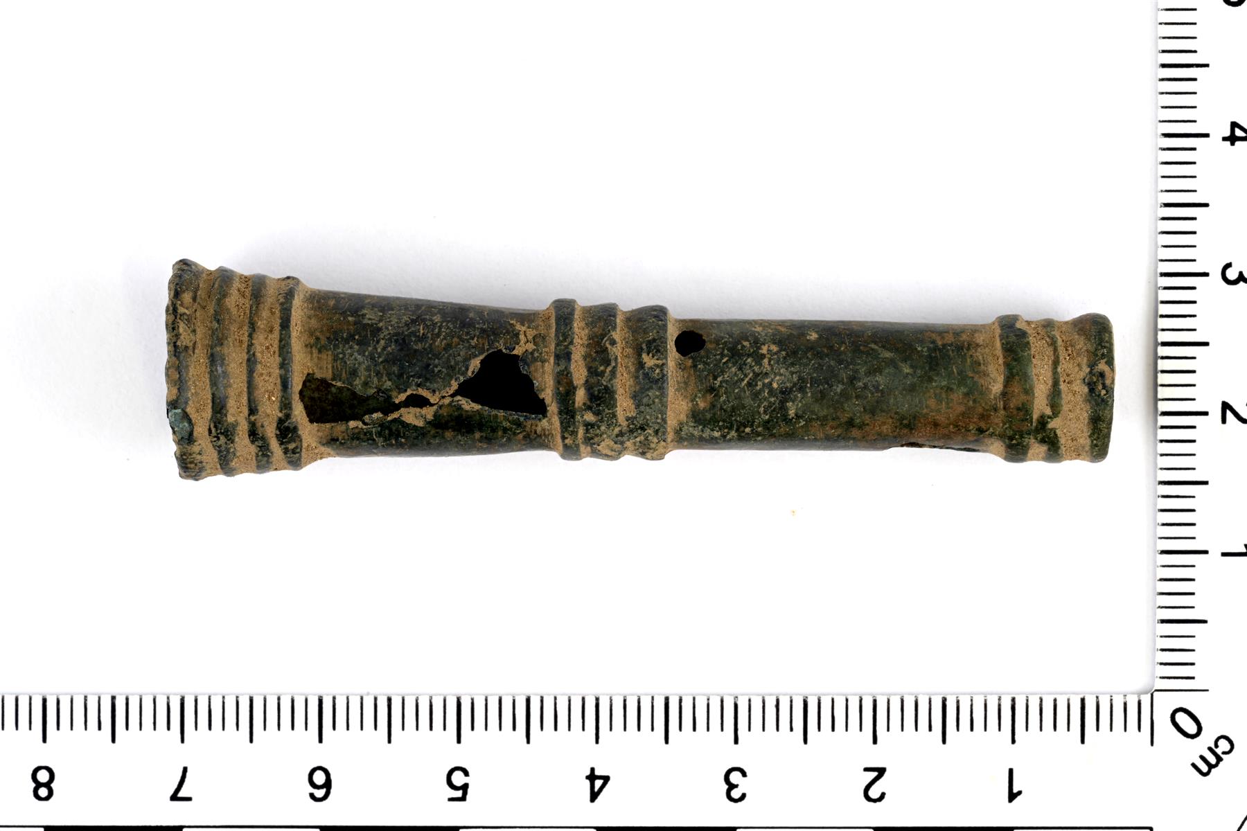 | Pyöreä ja toiseen päähän levenevä kupariseosputki. Päädyissä ja keskellä on koristeena kohovöitä. Putki on hieman rikkoutunut. Vrt. SU 3577: 5. | |